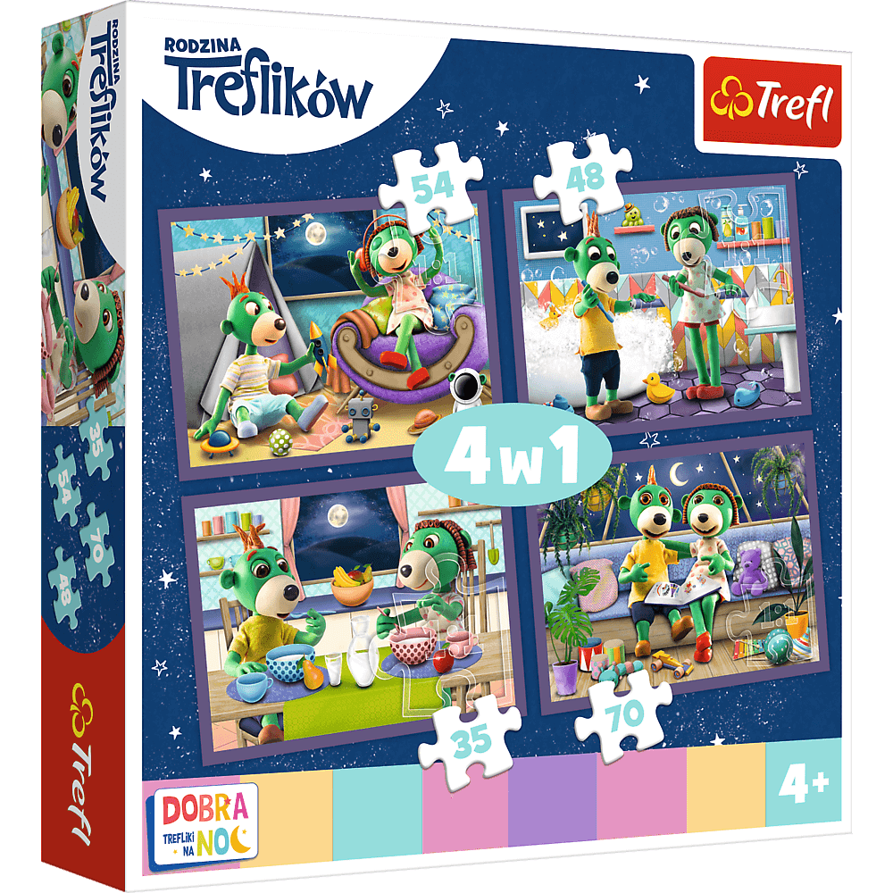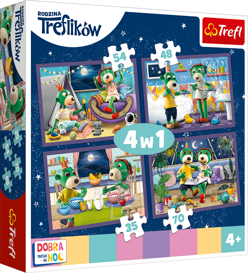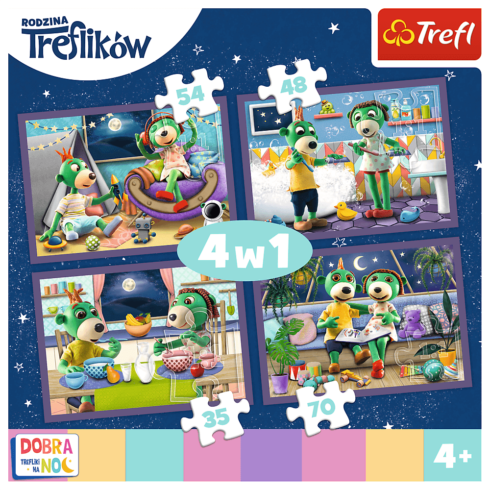 Wieczorne rytuały Treflików - Dobranoc, Trefliki na noc to puzzle składające się z 4 niezależnych układanek, zaprojektowane z myślą o wszystkich fanach i fankach niezwykłych przygód bohaterów "Rodziny Treflików". Po ułożeniu puzzli powstaną cztery obrazki o wymiarach 285 x 205 mm każdy. Zróżnicowana liczba elementów (70, 54, 48 i 35) pozwala na zabawę zarówno młodszym, jak i nieco starszym fanom puzzli. Każdy obrazek przedstawia szereg typowych, wieczornych czynności Treflików, takie jak zabawa, jedzenie kolacji, kąpiel, a także czytanie książek.