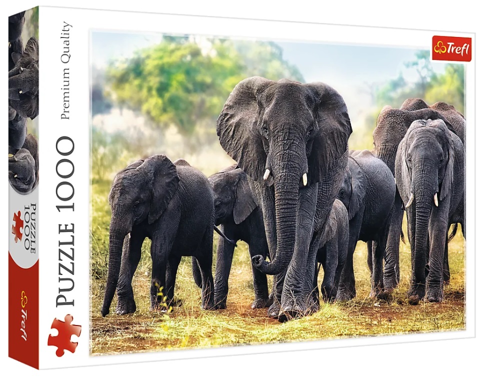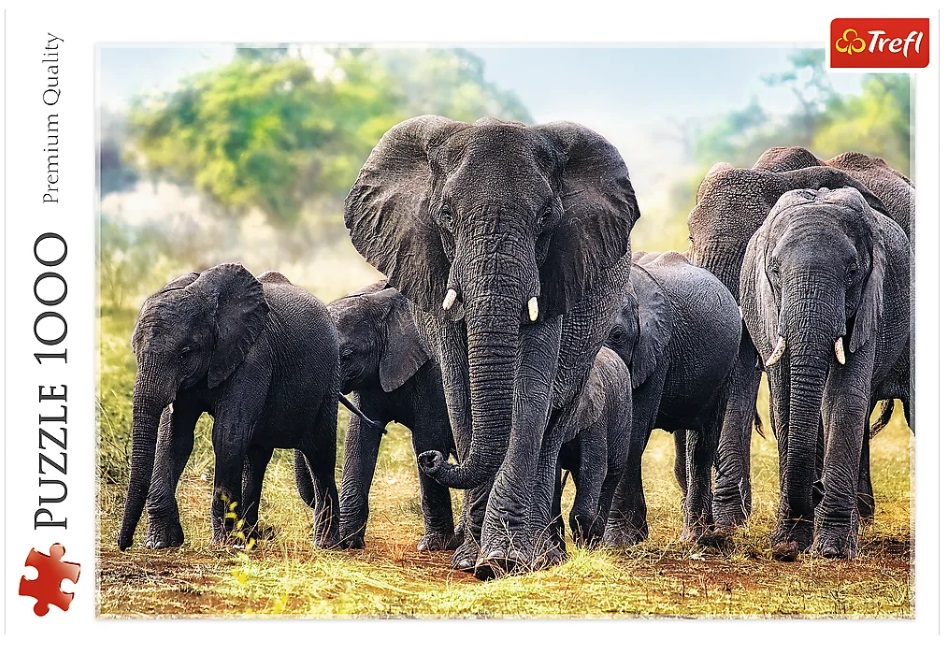 Puzzle 1000 elementów przedstawiające słonie afrykańskie. Po ułożeniu powstanie obrazek o wymiarach 68x48 cm. Wysoką jakość, nasycenie kolorów i bezpieczeństwo układania zapewnia kalandrowany papier odbijający światło, pokryty ekologicznymi farbami spożywczymi..