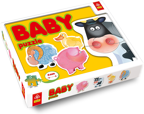 Baby Zwierzęta z Farmy to pierwsze puzzle dla najmłodszych dzieci. Bardzo wyraźne kolory, proste wzornictwo i duże klocki sprawiają, że nawet najmłodsze dziecko z łatwością dopasuje poszczególne elementy obrazka. Układanka rozwija zdolności manualne dziecka i poszerza jego wiedzę o otaczającym świecie.