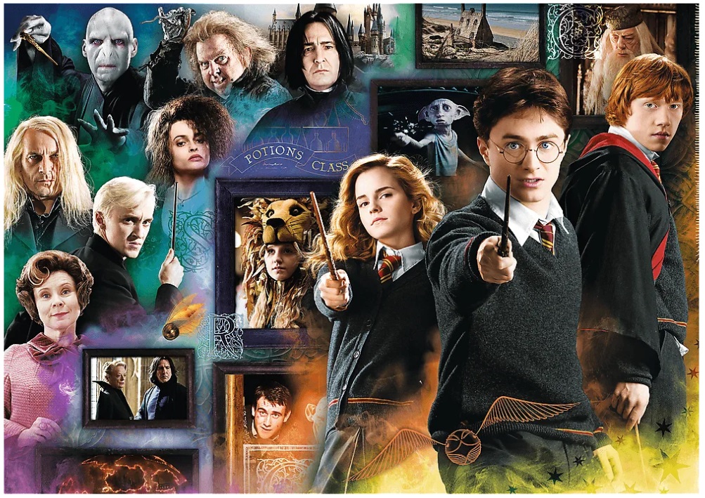 Puzzle składające się z 1000 elementów przedstawiające bohaterów z serii filmów Harry Potter. Po ułożeniu powstanie obrazek o wymiarach 683x480 mm.