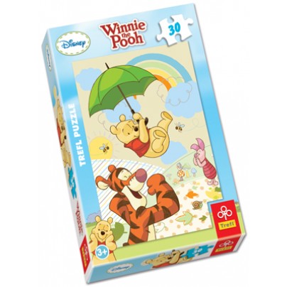 Trefl Puzzle Kubuś Jesienny Wietrzyk 30 elementów pozwala na ułożenie obrazka przedstawiającego zabawę trzech przyjaciół ze Stumilowego Lasu. Kubuś Puchatek lata na zielonym parasolu oraz Tygrysek z Prosiaczkiem hasający na polance bawią się w najlepsze podczas jesiennej pogody. Ta logiczna układanka, gdzie składowe elementy pasują do siebie w jeden niepowtarzalny sposób, rozwija wyobraźnię i logiczne myślenie.