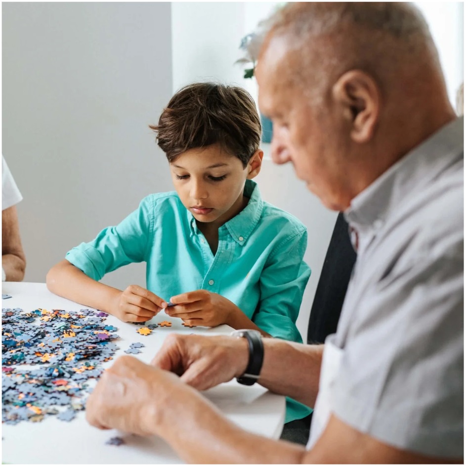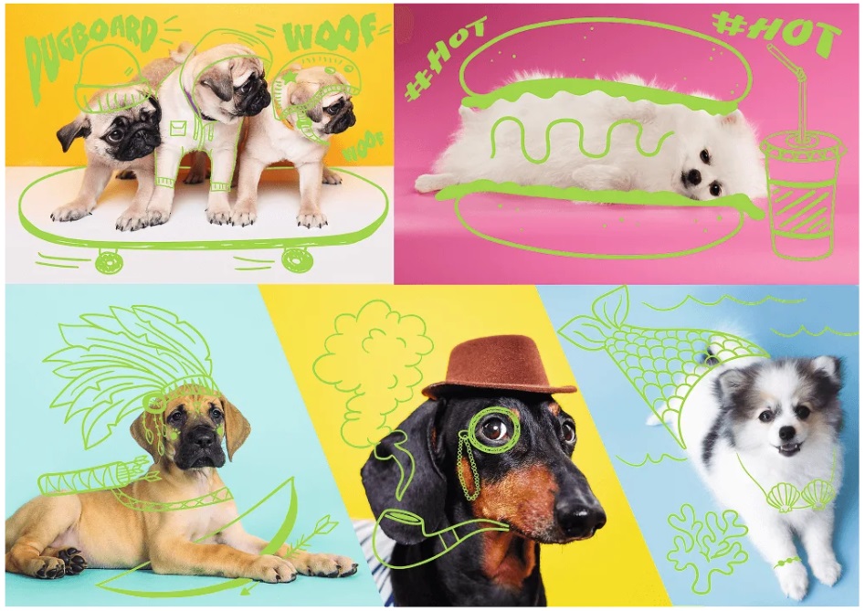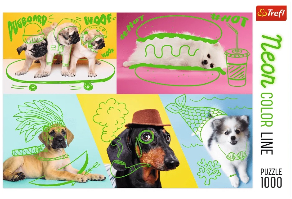 Puzzle składają się z 1000 elementów i przedstawiają słodkie psy różnych ras. Całość urozmaicają neonowe elementy. Po ułożeniu powstanie obrazek o wymiarach 683x480 mm.