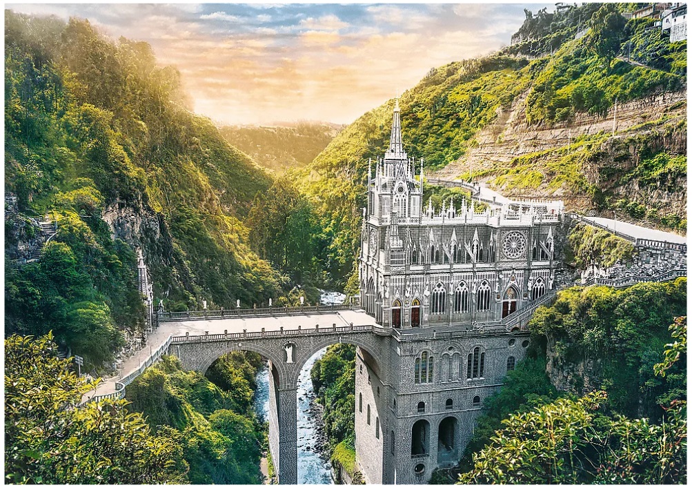 Puzzle składające się z 1000 elementów przedstawiające zapierający dech w piersiach widok na Sanktuarium Las Lajas w Kolumbii.