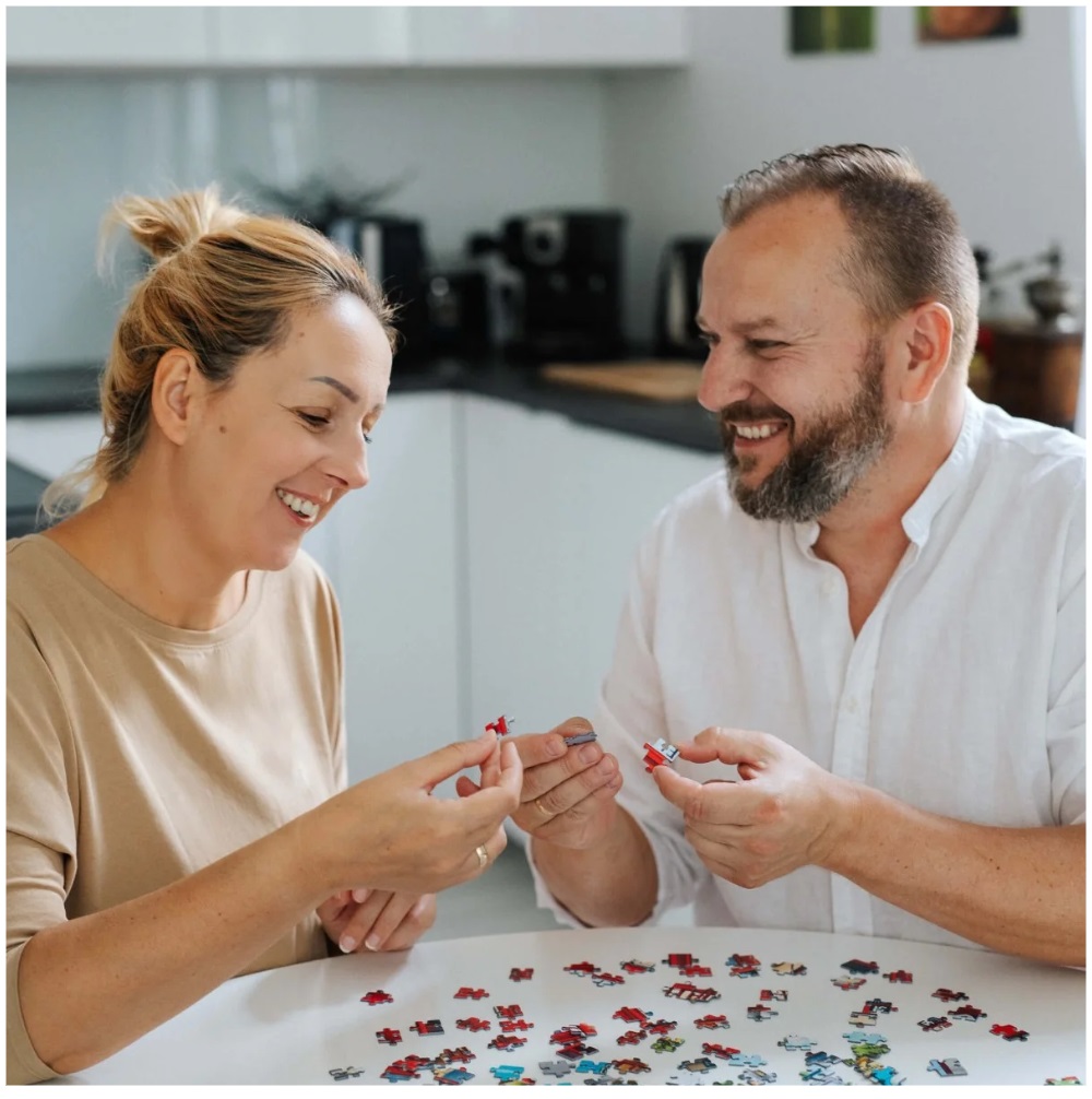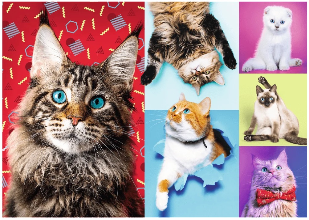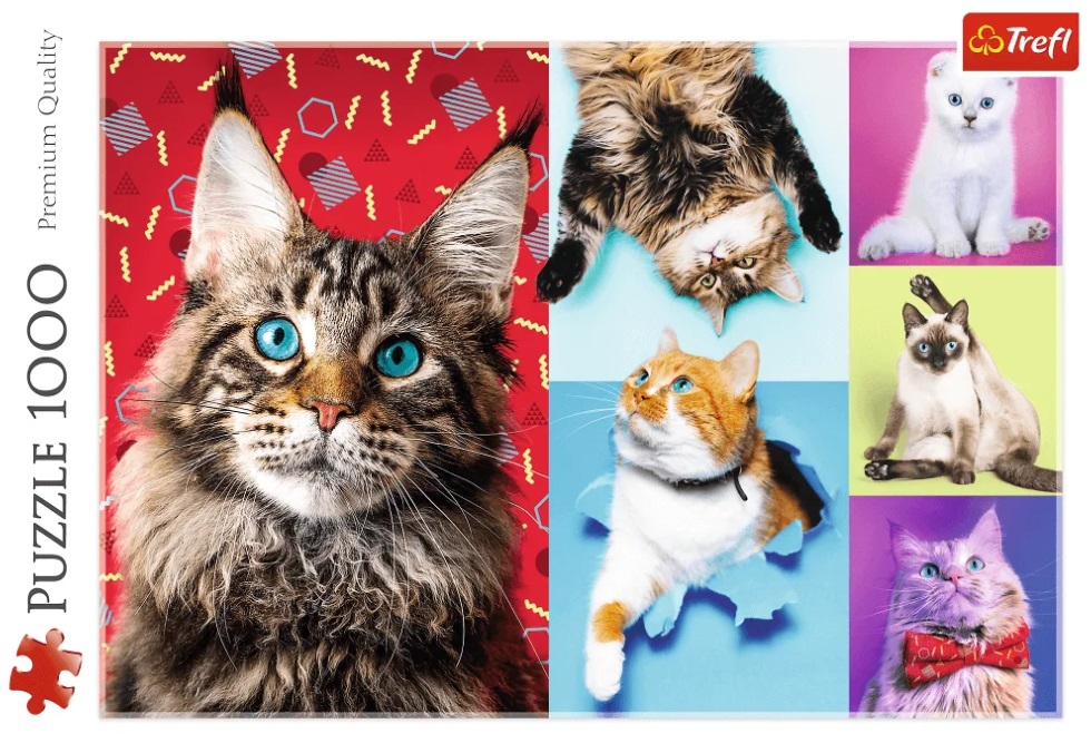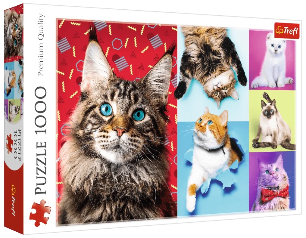 Puzzle "Wesołe koty" składające się z 1000 elementów przedstawiające kolaż zdjęć uroczych kotów, różnych ras. Po ułożeniu powstanie obrazek o wymiarach 683x480 mm.