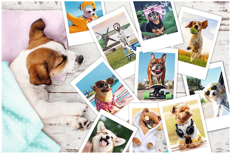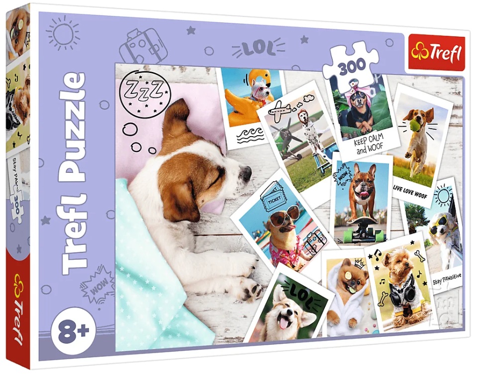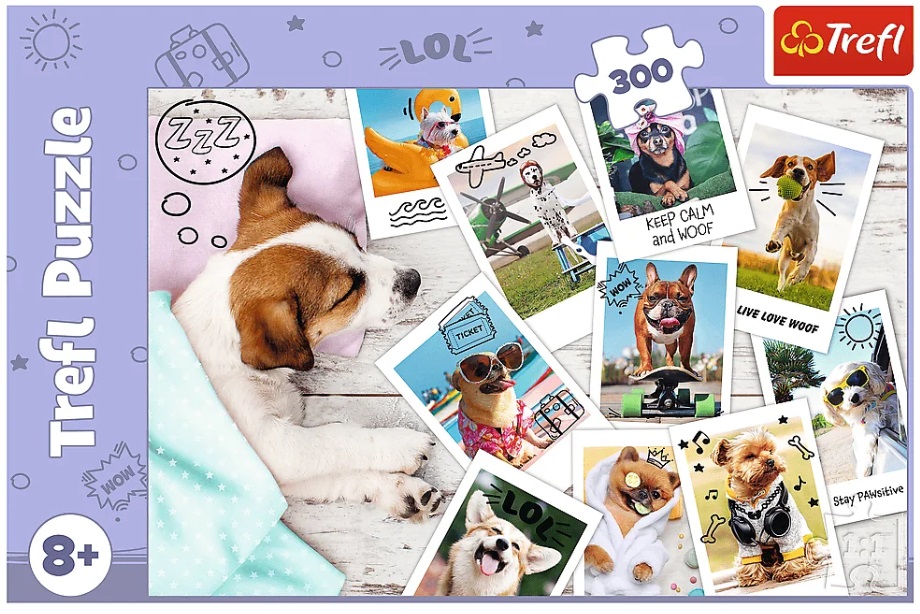 Zdjęcia z Wakacji to puzzle składające się z 300 elementów przedstawiające śmieszne zdjęcia piesków z podróży.