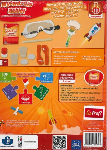 Dowiedz się, jak balon może stać się niesamowitą rakietą i urządź zawody rakiet! Zawartość zestawu: Książeczka edukacyjna Drewniana szpatułka Małe miarki z pokrywką Balony Okulary ochronne Wodorowęglan sodu. Dla dzieci w wieku od 8 lat.