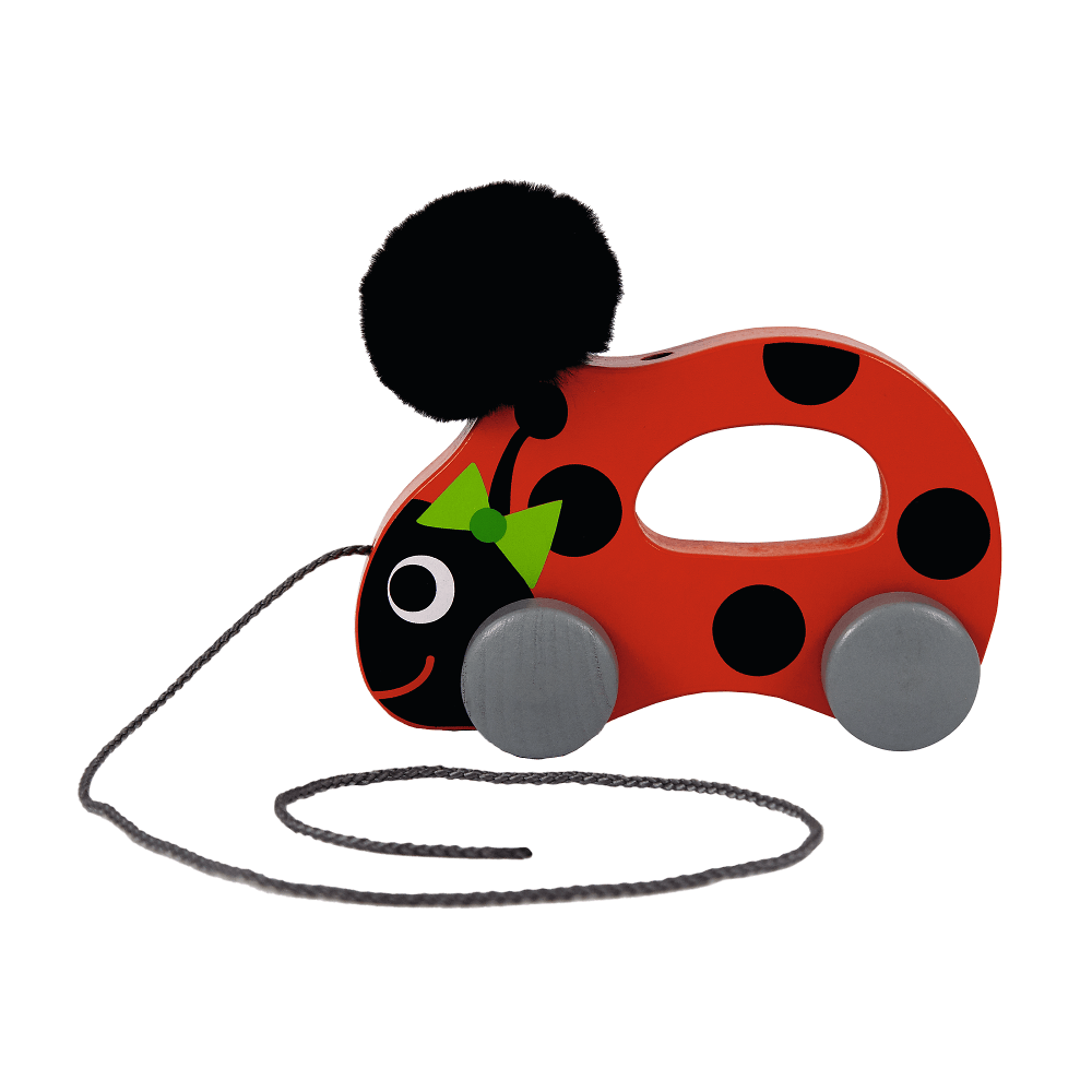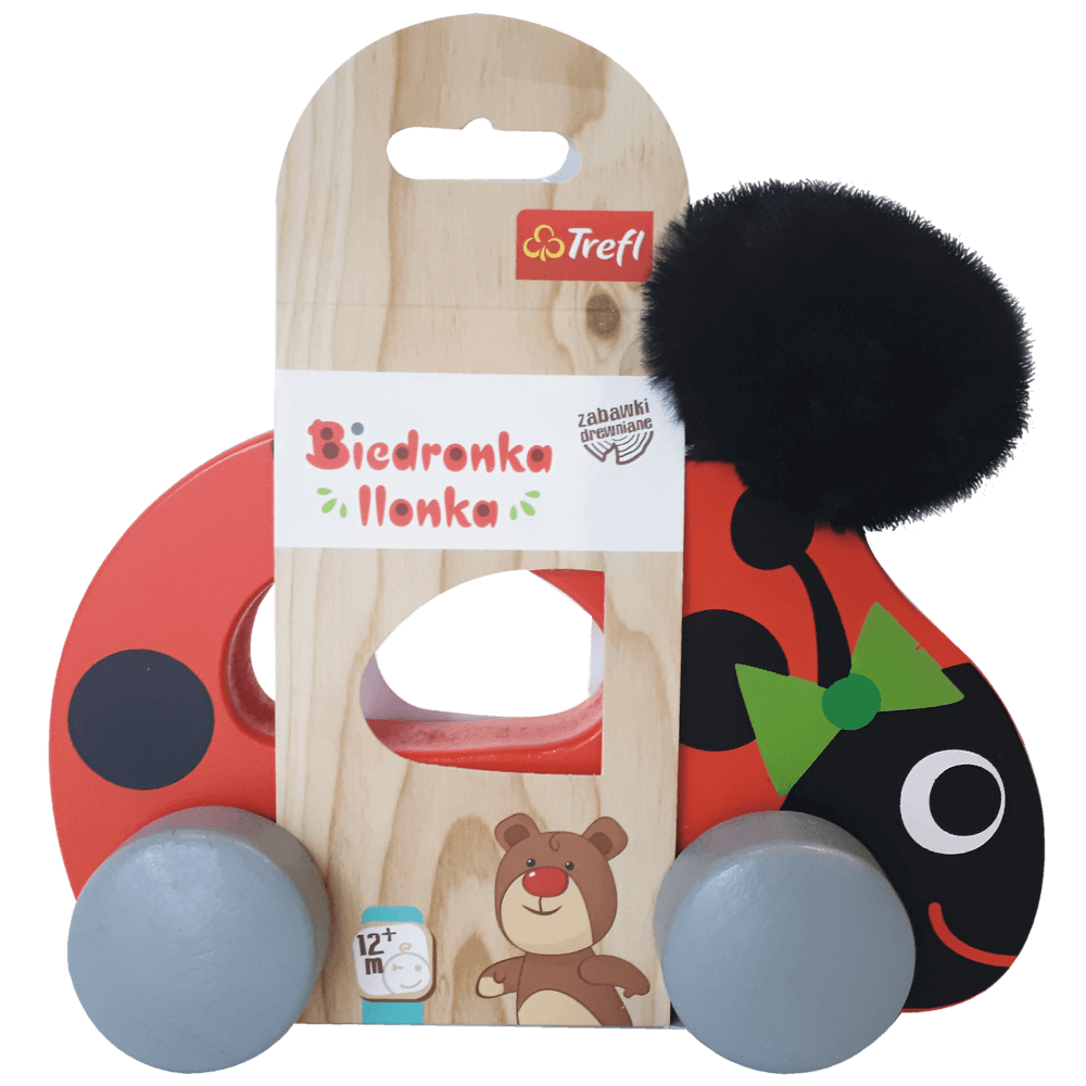 Biedronka Ilonka to zabawka, która wykonana została z jasnego, naturalnego drewna. Jest doskonałą zabawką, która towarzyszy najmłodszym przy stawianiu pierwszych kroków. Znakomite rozwiązanie dla dzieci od 12 miesiąca życia. Zabawka zachęca do wspólych spacerów, rozwijając dodatkowo odruch chwytania, dzięki ergonomicznemu kształtowi zaprojektowanemu specjalnie dla małych rączek. Biedronaka Ilonka wyposażona jest w sznureczek i małe drewniane kółeczka, dzięki którym zawsze podąża za swoim opiekunem. Zabawka posiada miły i puszysty pompon, który wspiera rozwój sensoryczny dziecka poprzez dotyk. Wszystkie materiały wykorzystane do stworzenia zabawki posiadają atesty, a także zostały pomalowane nietoksycznymi farbami.