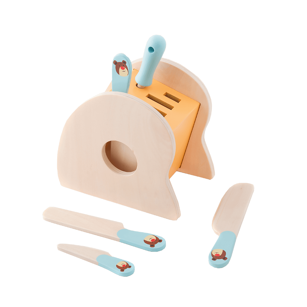 Ciach, ciach, ciach to zestaw 4 drewnianych noży i osełki ze stojakiem - idealny do dziecięcej kuchni. Wykonany z jasnego, naturalnego drewna. Dzięki zabawie dziecko uczy się kuchennego savoir - vivre, doskonali precyzję oraz rozwija umiejętności manualne. Wszystkie materiały wykorzystane do stworzenia tej drewnianej zabawki posiadają atesty, a także zostały pomalowane nietoksycznymi farbami.