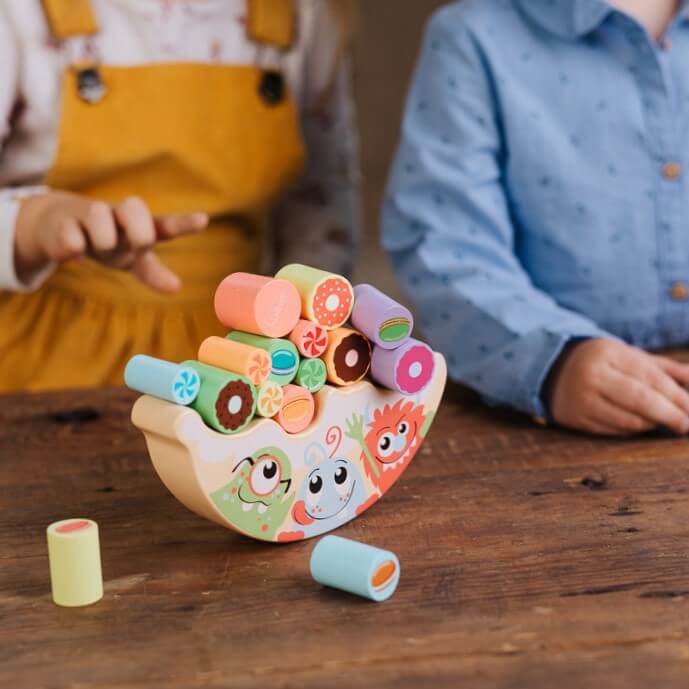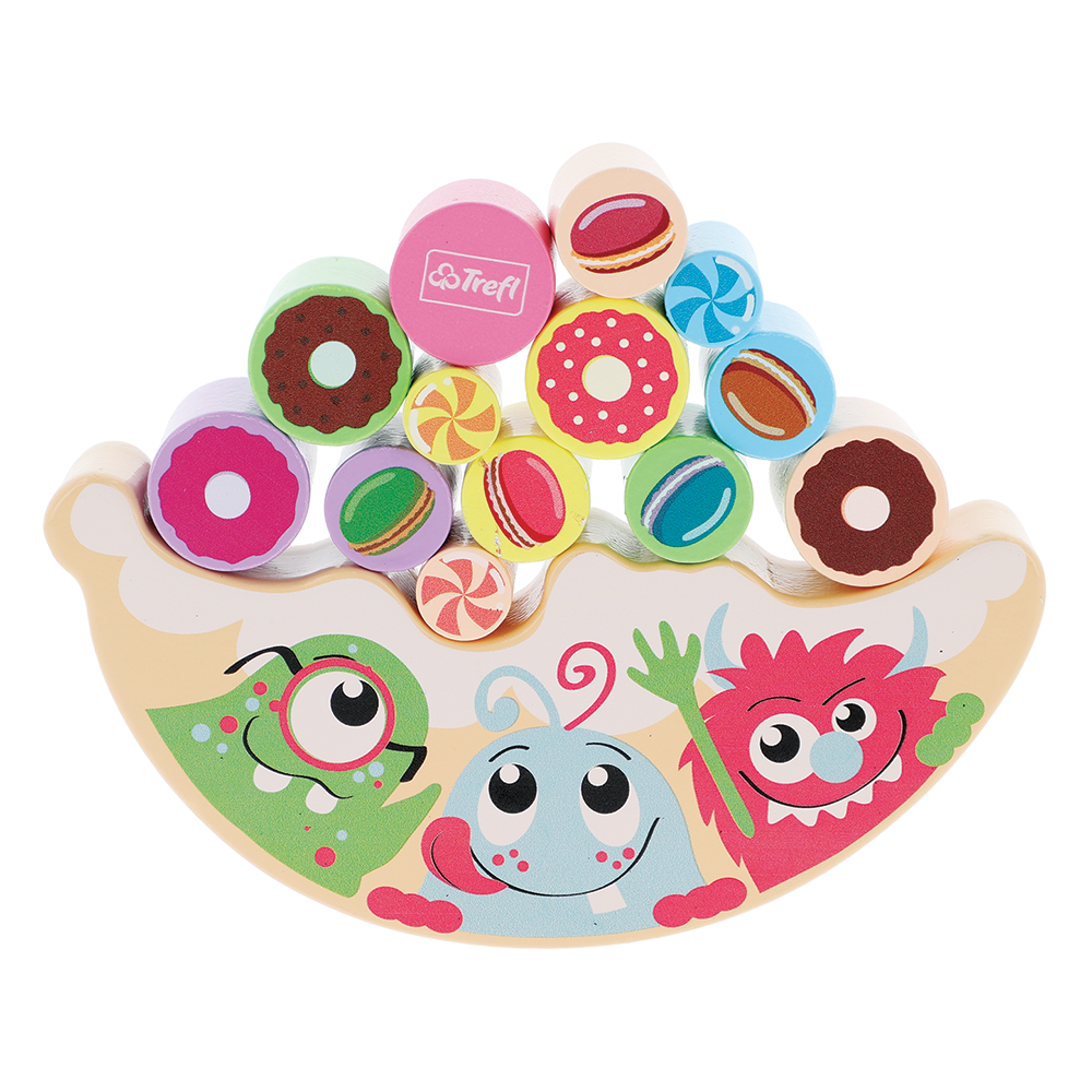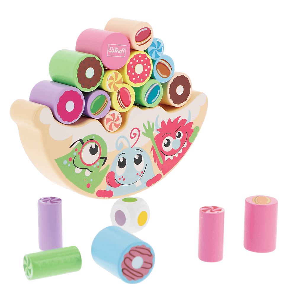 Łakocie w Locie to zabawka wykonana z wysokiej jakości naturalnego drewna. Zabawa polega na ułożeniu nad głowami ciasteczkowych potworków jak największej ilości łakoci przy jednoczesnym zachowaniu równowagi całej konstrukcji. Znakomite rozwiązanie dla dzieci od 3 roku życia, które dzięki zabawce poznają pojęcie równowagi oraz nauczą się cierpliwości Łakocie w locie pobudzają wyobraźnię, uczy koncentracji i wzmacniają relacje.