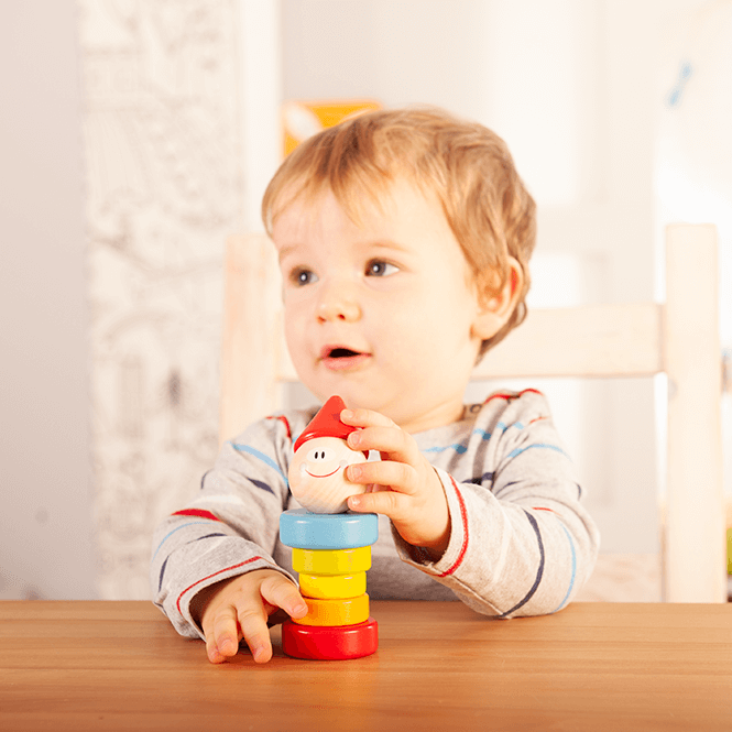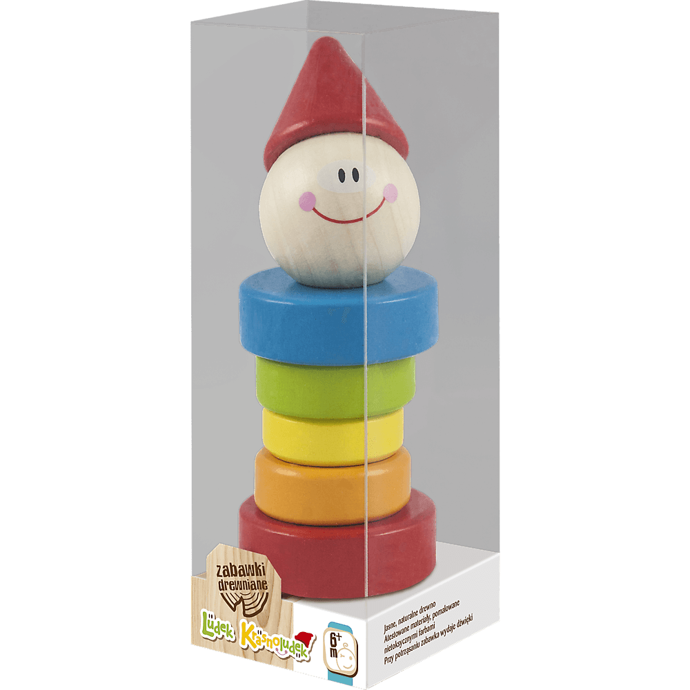 Wesoły ludek wykonany z jasnego, naturalnego drewna jest doskonałą zabawką ogólnorozwojową. Znakomite rozwiązanie dla dzieci od 6 miesiąca życia. Wspomaga rozwój koordynacji ruchowej, kształtując dodatkowo odruch chwytania. Wszystkie materiały wykorzystane do stworzenia zabawki posiadają atesty, a także zostały pomalowane nietoksycznymi farbami.
