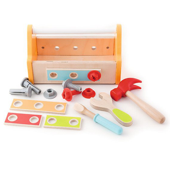 Kuferek Majsterek to zestaw narzędzi dla każdego małego majsterkowicza. W skład zestawu wchodzą: młotek, klucz płaski, dłuto, śrubki, podkładki, skrzynka. Zestaw wykonany z jasnego, naturalnego drewna. Wszystkie materiały wykorzystane do stworzenia zabawki posiadają atesty, a także zostały pomalowane nietoksycznymi farbami.