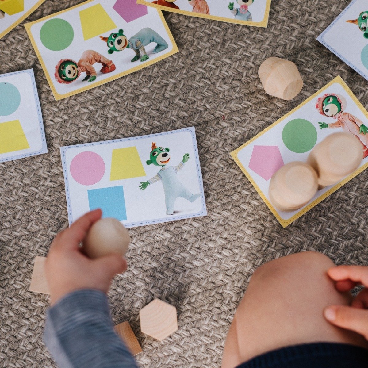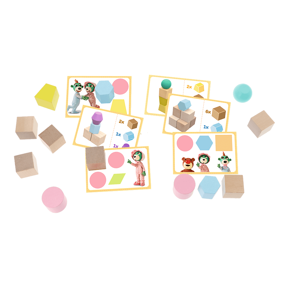 Dopasuj odpowiedni kształt klocka do obrazka znajdującego się na dużej karcie lub odwzoruj konstrukcję z karty w przestrzeni!