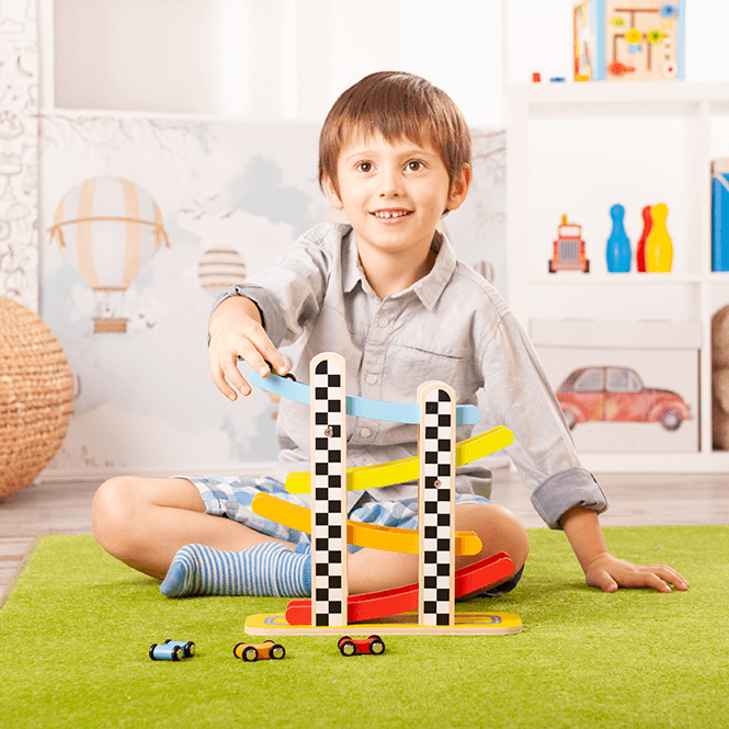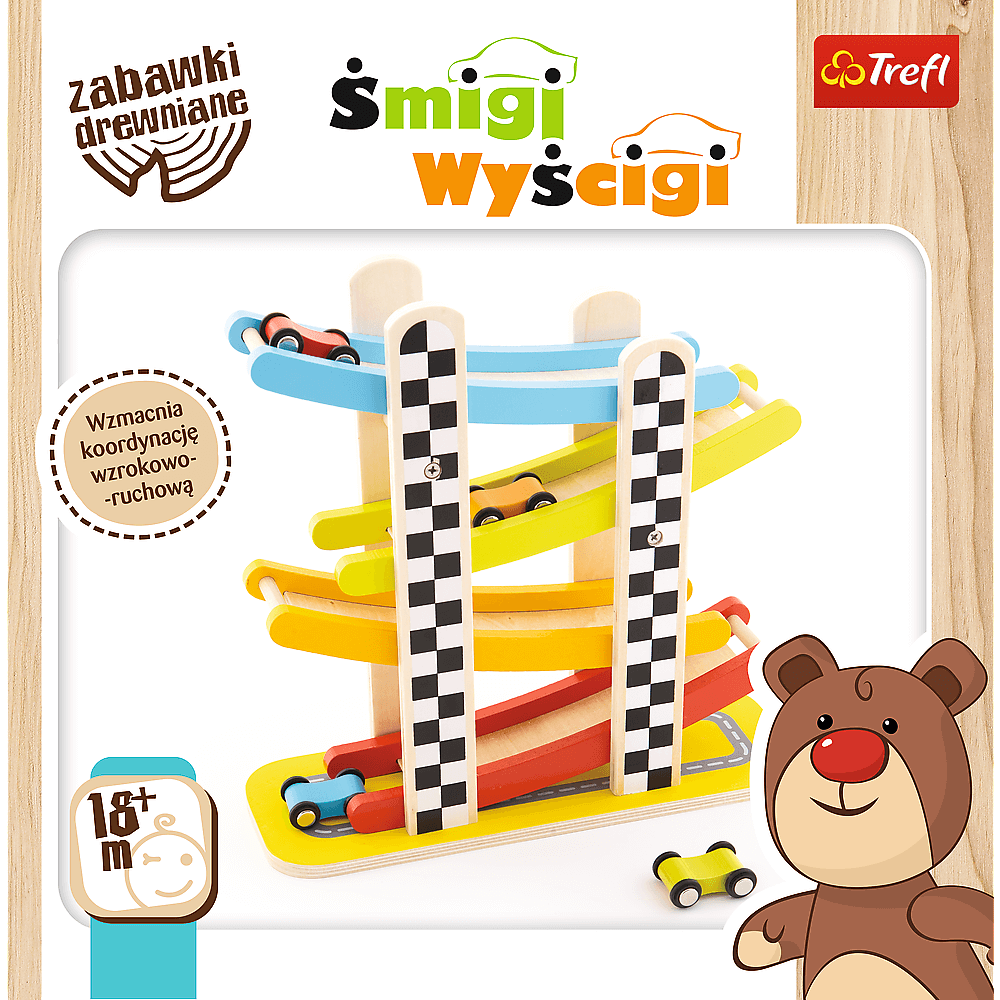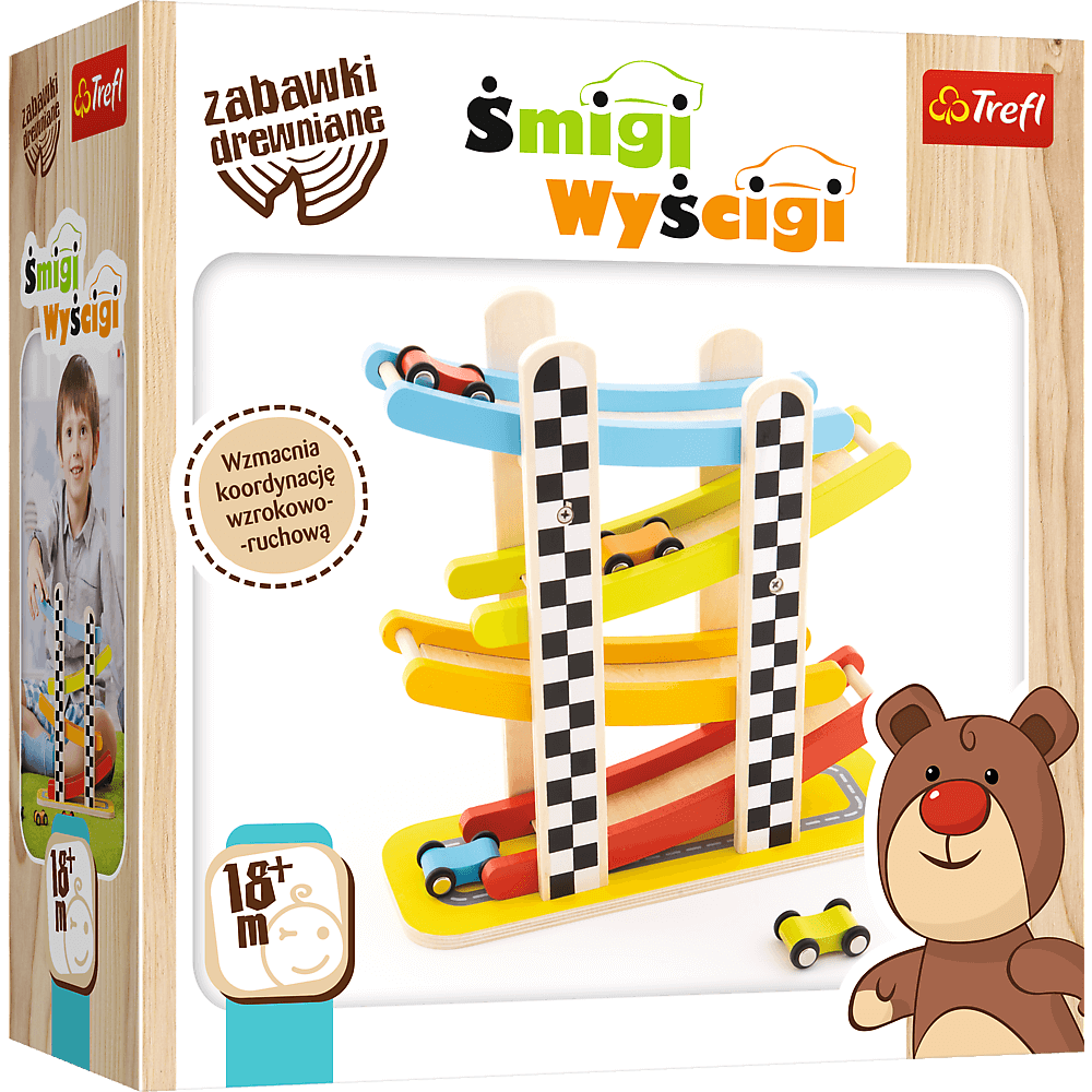 Śmigi Wyścigi to widowiskowa zjeżdżalnia wykonana z jasnego, naturalnego drewna jest doskonałą zabawką ogólnorozwojową. Cztery kolorowe samochodziki i tyle samo poziomów zjazdów zachęcają do wspólnej zabawy, wzmacniając dodatkowo koordynację wzrokowo-ruchową. Wszystkie materiały wykorzystane do stworzenia zabawki posiadają atesty, a także zostały pomalowane nietoksycznymi farbami.