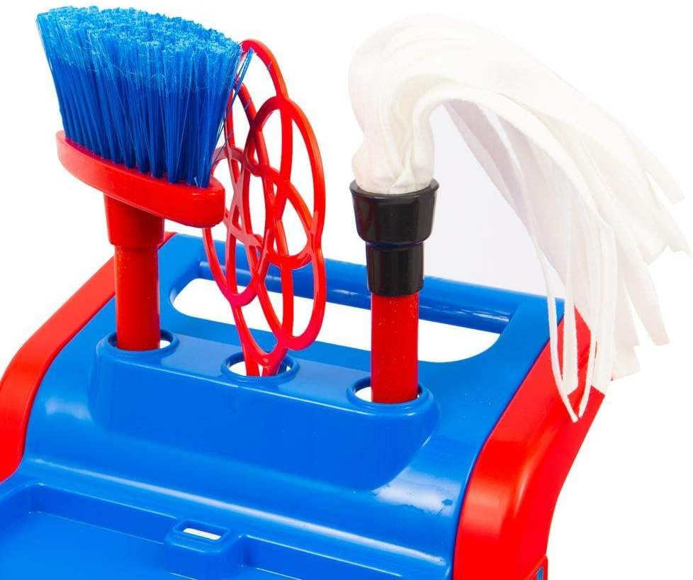Wózek do sprzątania dla najmłodszych, którzy chcą pomóc mamie i tacie w pracach domowych. Zestaw zawiera wiadro z wyciskarką, mop, miotłę i trzepaczkę. Wózek jest łatwy w montażu. Dzieci będą mogły w zabawny sposób uczyć się prac domowych rodziców, ćwiczyć zdolności motoryczne i uruchamiać wyobraźnię. Cały zestaw mierzy ok. 48 cm.