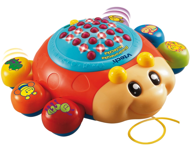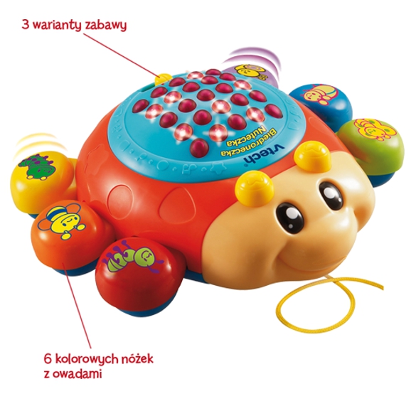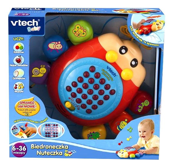 Vtech Biedroneczka Nuteczka 60079 pomaga dziecku odkrywać zupełnie świat! Naciskając nóżki zabawki, dziecko uczy się nazw owadów, ich imion i rozróżniania kolorów. Biedroneczka zadaje pytania, nagradzając dźwiękiem poprawną odpowiedź. Zabawie towarzyszą wesołe melodie. Możliwość prowadzenia zabawki za sznurek zachęca dziecko do samodzielnego chodzenia. Zabawka mówi i śpiewa po polsku.