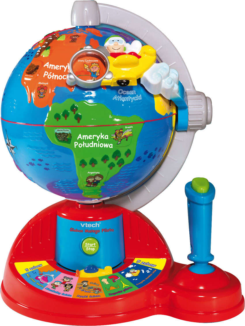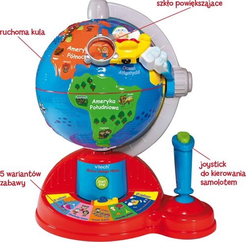 Podczas zabawy dziecko steruje samolotem i zatrzymuje lupę w miejscu, o którym chce usłyszeć ciekawostkę lub które wskazuje jako odpowiedź w zadaniu. Dzięki temu ćwiczy koordynację ruchową i spostrzegawczość, poznając jednocześnie podstawy geografii. Poprawne odpowiedzi zostaną nagrodzone. W odwiedzanych krajach maluch zostanie przywitany w obcym języku! Wyląduje też w znanych miejscach świata, by przy dźwięku silnika wyruszyć w dalszą podróż. Globus kręci się w trakcie lotu, co gwarantuje fantastyczną zabawę na okrągło! Zapraszamy dzieci do podróży przez kolorowy świat VTech!