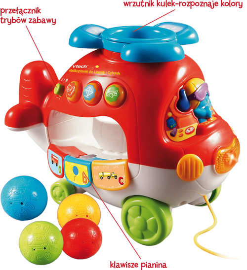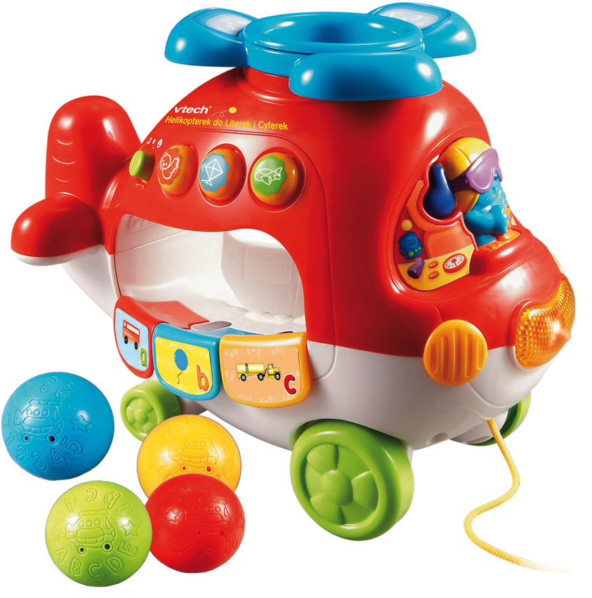 Zachęć dziecko do zabawy edukacyjnym Helikopterkiem do Literek i Cyferek firmy VTech. Pociągnij Helikopterek za sznurek, pograj na klawiszach pianina albo naciśnij różne przyciski uczące nazw przedmiotów. Kilkanaście melodii i piosenek urozmaici zabawę Twojego dziecka. Gdy maluszek wrzuca kulki, Helikopterek uczy liczenia oraz nazw kolorów. Zabawne muzyczne odpowiedzi pomagają dziecku zrozumieć zasadę przyczyny i skutku. Ciekawość jest zawsze nagradzana błyskaniem światełek, zabawnymi zwrotami, muzyką i piosenkami.