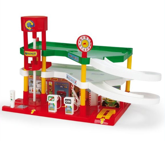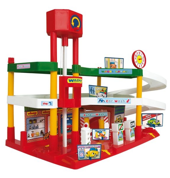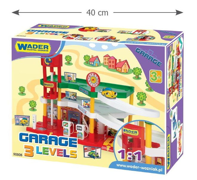 Wader Garaż 3-poziomowy 50505 to wielofunkcyjny budynek w sam raz na resoraki Twojego dziecka. Autka wyjeżdżają windą na poszczególne poziomy i zjeżdżają z nich zjazdami aż na parter. Bawiący się maluch może też autko umyć w myjni, naprawić w auto serwisie lub zatankować na stacji benzynowej.