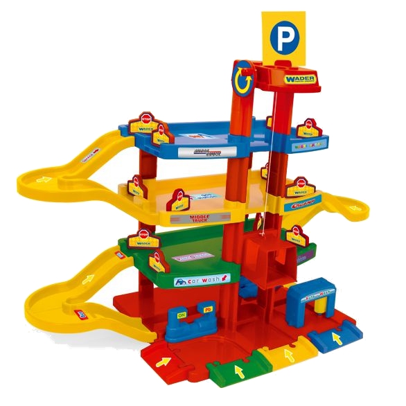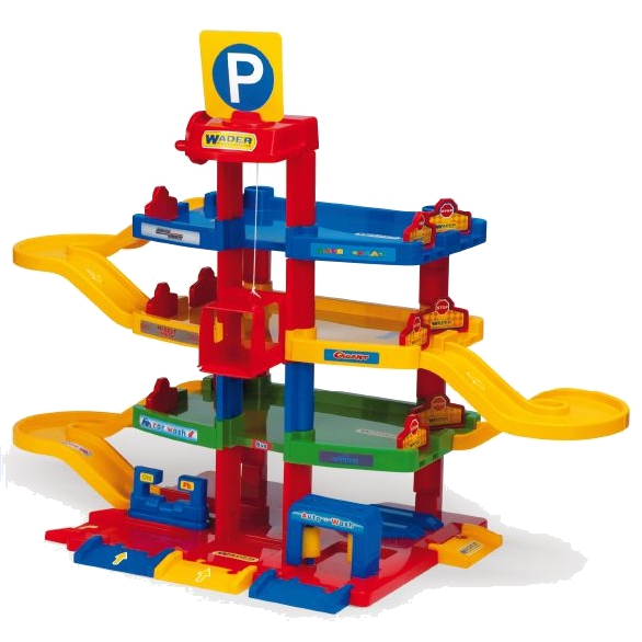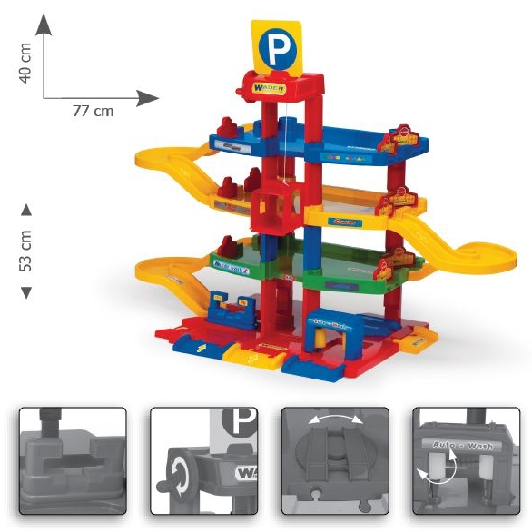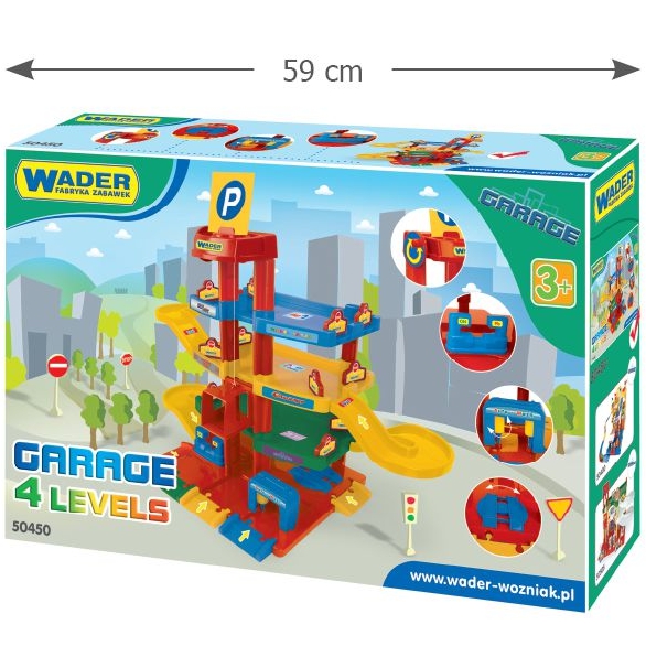 Wader Garaż 4-poziomowy 50450 to w pełni wyposażony garaż miejski. Dysponuje stacją benzynową, myjnią oraz serwisem naprawczym. Za pomocą windy możemy przemieszczać autka na poszczególne poziomy garażu, a następnie zjeżdżać z nich zjazdami aż na parter. Bawiąc się zestawem, każdy może poczuć się prawdziwym kierowcą tankując autko, naprawiając go w serwisie czy też myjąc w myjni.