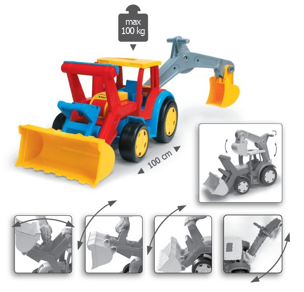 Wader Gigant Traktor Koparko Ładowarka 66500 to okazały pojazd o długości 100 cm i ogromnej wytrzymałości nacisku do 100 kg, który posiada wiele ruchomych elementów tj. przednią łychę oraz znajdujące się z tyłu pojazdu ramię koparki. Dziecko może jeździć na koparce siedząc na kabinie i odpychając się nogami, a dzięki zamontowanej rączce trzymać się i czuć bezpiecznie podczas jazdy.