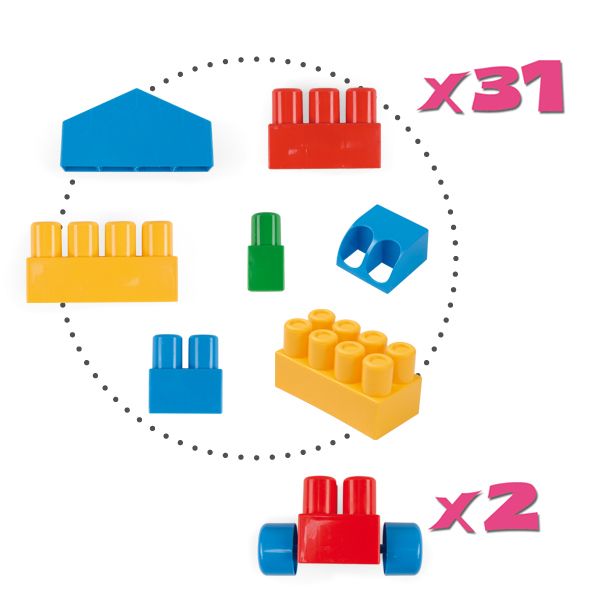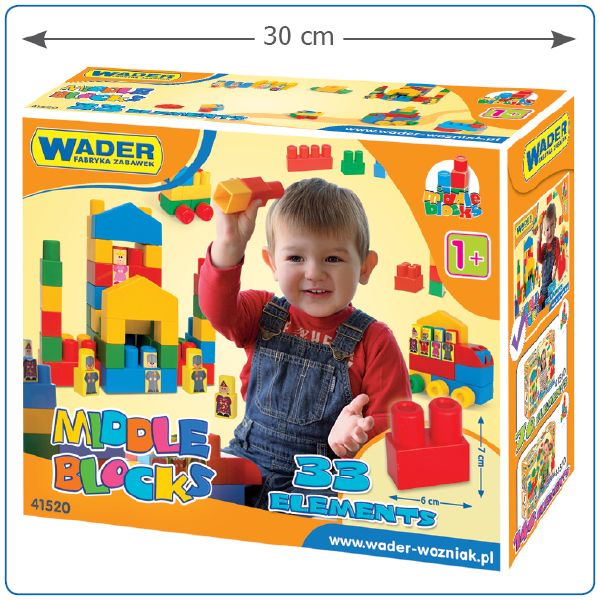 Middle Blocks Big to zestaw 33 klocków o ciekawej kolorystyce wykonanych z wysokiej jakości tworzywa sztucznego. Ze względu na swoje gabaryty są idealnie dostosowane do rączek najmłodszych dzieci a różnorodność form umożliwia tworzenie z klocków rozmaitych budowli, pojazdów i postaci rozwijając w dziecku wyobraźnię dziecka i jego zdolności manualne. Klocki, ze względu na swoje gabaryty, zapewniają bezpieczną zabawę dzieciom już od pierwszego roku życia.