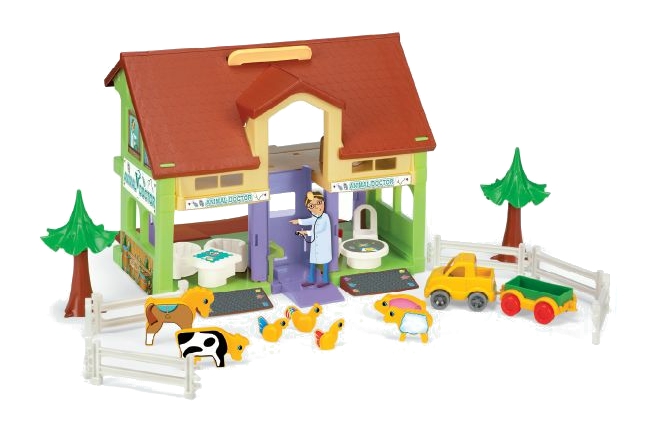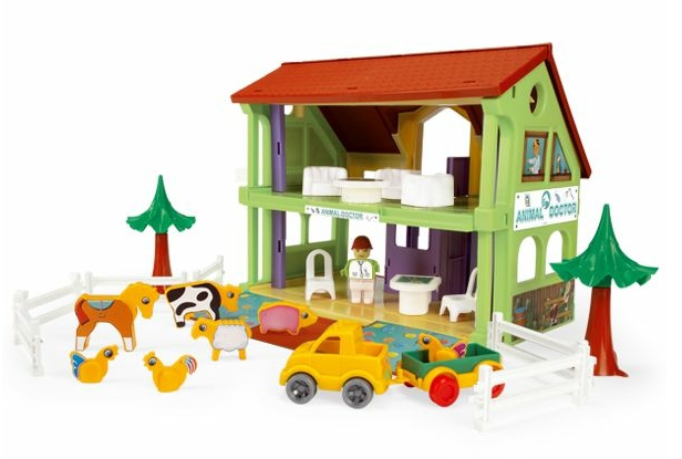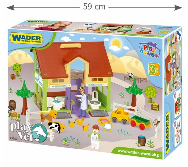 Wader Play House Weterynarz 25460 Play Vet, czyli weterynarz firmy Wader to dwupiętrowy, kolorowy domek, dzięki któremu zabawa w dom i lekarza będzie o wiele atrakcyjniejsza. Na wyposażeniu zestawu znajduje się ruchoma winda, miniaturowy weterynarz, samochód z przyczepką oraz liczne stado zwierząt hodowlanych.