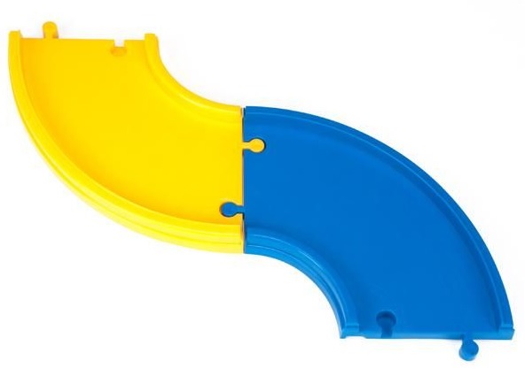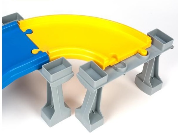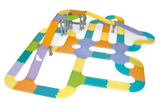Produkt bezpieczny dla dzieci już od pierwszego roku życia! Zabawkę cechuje łatwa i prosta konstrukcja zabawki, atrakcyjna kolorystyka elementów oraz zastosowany system łączeń, który pozwala na przenoszenie złożonej trasy unikając jej demontażu czy rozpadu. Produkt posiada w zestawie zjazdy i nogi umożliwiając zabawę na dwóch poziomach. Trasa z szarymi filarami o łącznej długości 14,2 m.