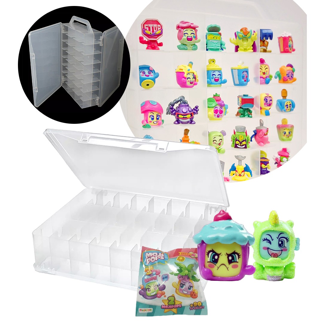 Ten wygodny i użyteczny organizer udostępnia 46 funkcjonalnych przegródek, a dzięki idealne przylegającemu wieku mamy gwarancję, że wszystkie umieszczone wewnątrz elementy pozostaną na swoim miejscu nawet podczas transportu. Całość została wykonana z wysokiej jakości przezroczystego plastiku. Walizka posiada wygodną rączkę. Walizka pomieści swobodnie 96 figurek wielkości Moji Pops oraz 48 autek Hot Wheels czy Matchbox.