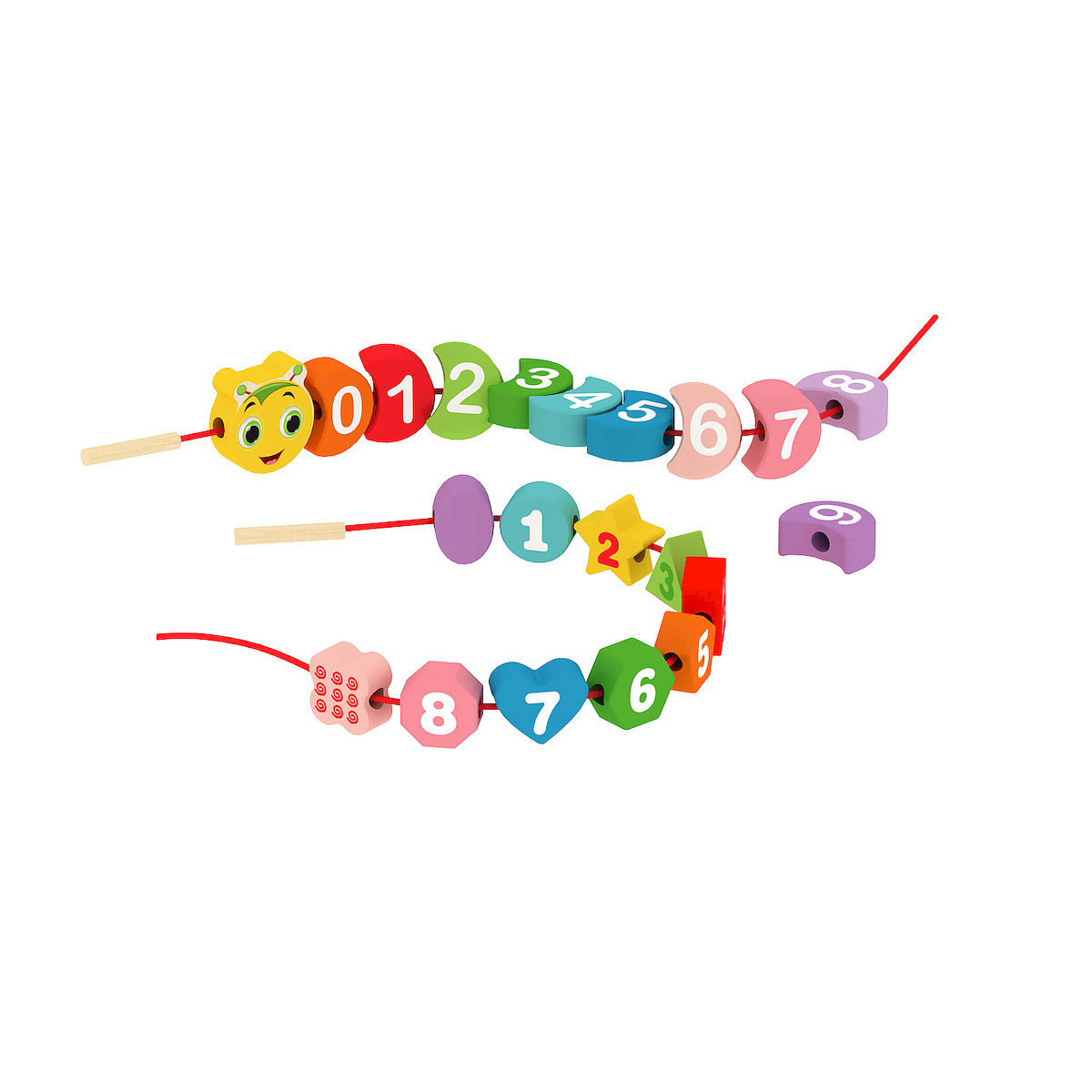 Drewniana gąsienica z cyferkami i liczmanami. Elementy mają różne kształty i kolory. Dzięki tej zabawce Twoje dziecko nauczy się liczyć i pozna cyfry. Poza tym usprawni koordynację ręka-oko oraz będzie rozwijać małą motorykę. Nawlekanie elementów to nie tylko dobra zabawa, ale też nauka.