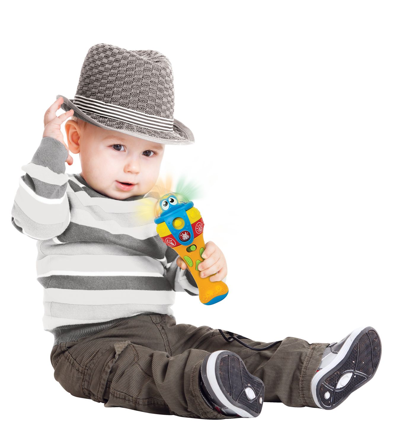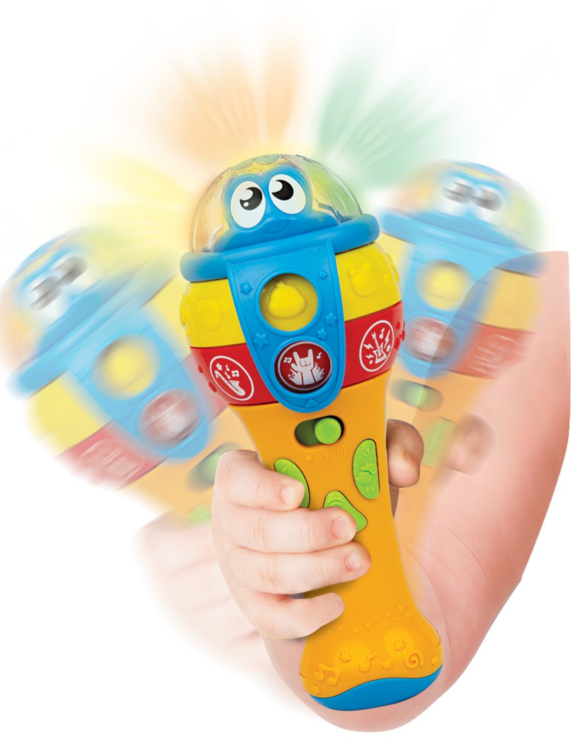 Mikrofon miga kolorowymi światełkami i gra wesołe melodie inspirując dziecko do tworzenia własnych utworów i układów tanecznych. Z nim każda zabawa będzie muzyczną przygodą! Mikrofon z odgłosami zwierząt, rytmami i kolorowymi migającymi światłami. Przekręć pierścienie, by odtworzyć odgłosy zwierząt i rytmy (25 różnych kombinacji dźwiękowych)
