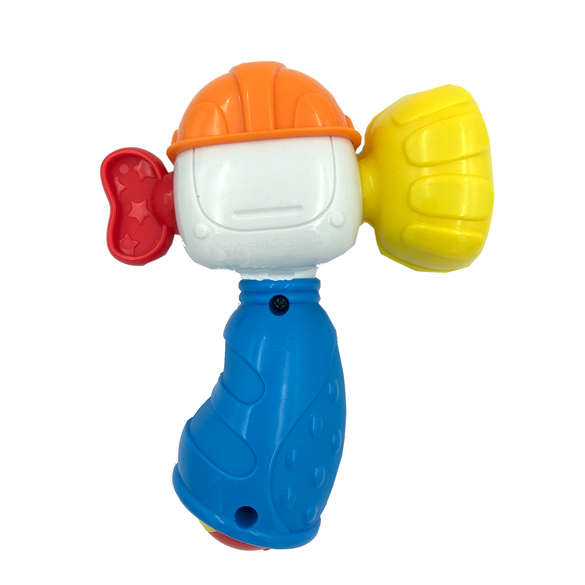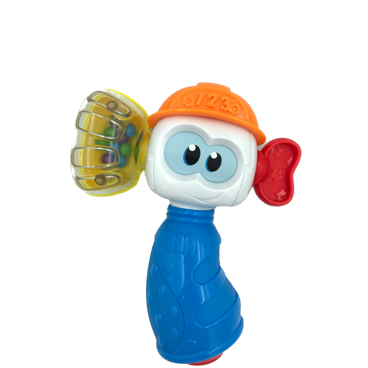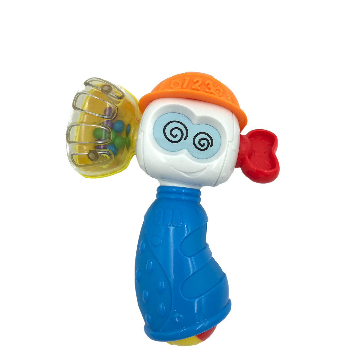 Mój Pierwszy Młotek to zabawka dla najmłodszych dzieci, które uwielbiają brać do rączek wszystko w zasięgu ręki. Młotek grzechotka ma ruchome elementy. Przekręcające się ucho, wydaje mechaniczne dźwięki i zmienia wyraz oczu. Umieszona w dolnej części kuleczka, obraca się zmieniając kolory i tekstury. Przy potrząsaniu zabawką kolorowe kuleczki grzechoczą.