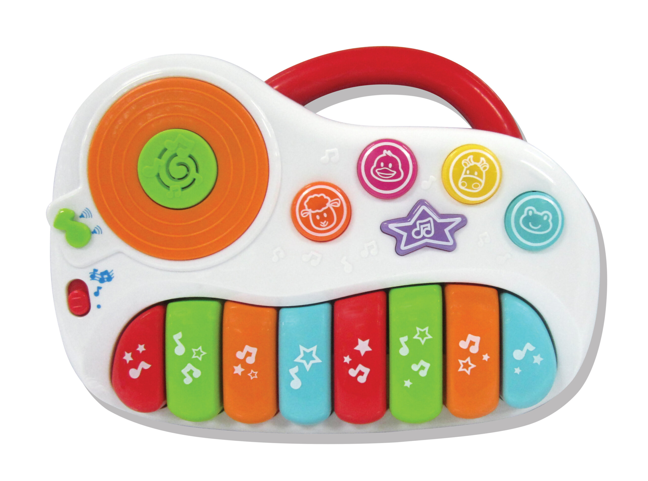 To muzyczna zabawka edukacyjna dla każdego malucha. Pianinko posiada osiem przycisków z dźwiękami gamy oraz cztery przyciski funkcyjne z wizerunkami zwierzątek – po naciśnięciu wydają dźwięki imitujące: muczenie, beczenie, gdakanie i kumkanie. Instrument pozwala dziecku na tworzenie pierwszych melodii. Zabawka wyposażona jest w przycisk on/off oraz regulację głośności.