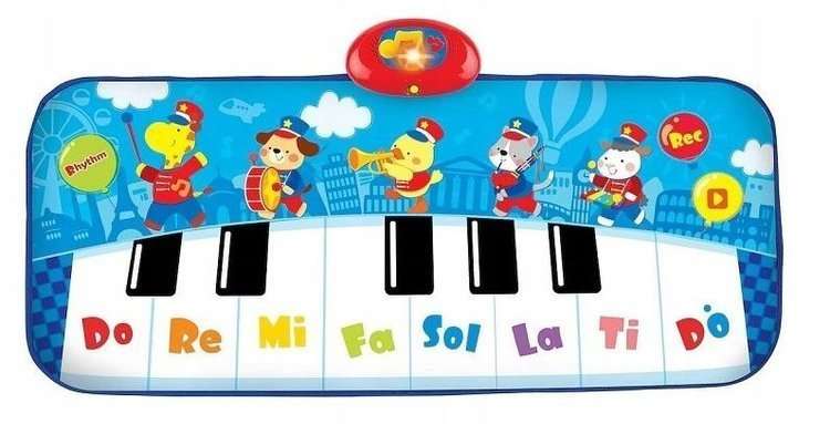 Edukacyjna mata doskonale sprawdzi się do tańca i zabawy. Mata ma funkcję nagrywania dzięki czemu własnoręcznie stworzysz swój indywidualny utwór.Wskocz na matę j i wygrywaj melodie i rytmy. Możesz miksować dźwięki gamy z odgłosami zwierzątek i zobaczyć jaka heca z tego wyjdzie. Zabawa jest bardzo prosta i przyjemna łączy gimnastykę z rozwojem zdolności muzycznych. Zabawa matą zaznajamia malucha z podstawowymi dźwiękami.Dziecko może uderzać w klawisze pianinka rączkami lub nóżkami.
