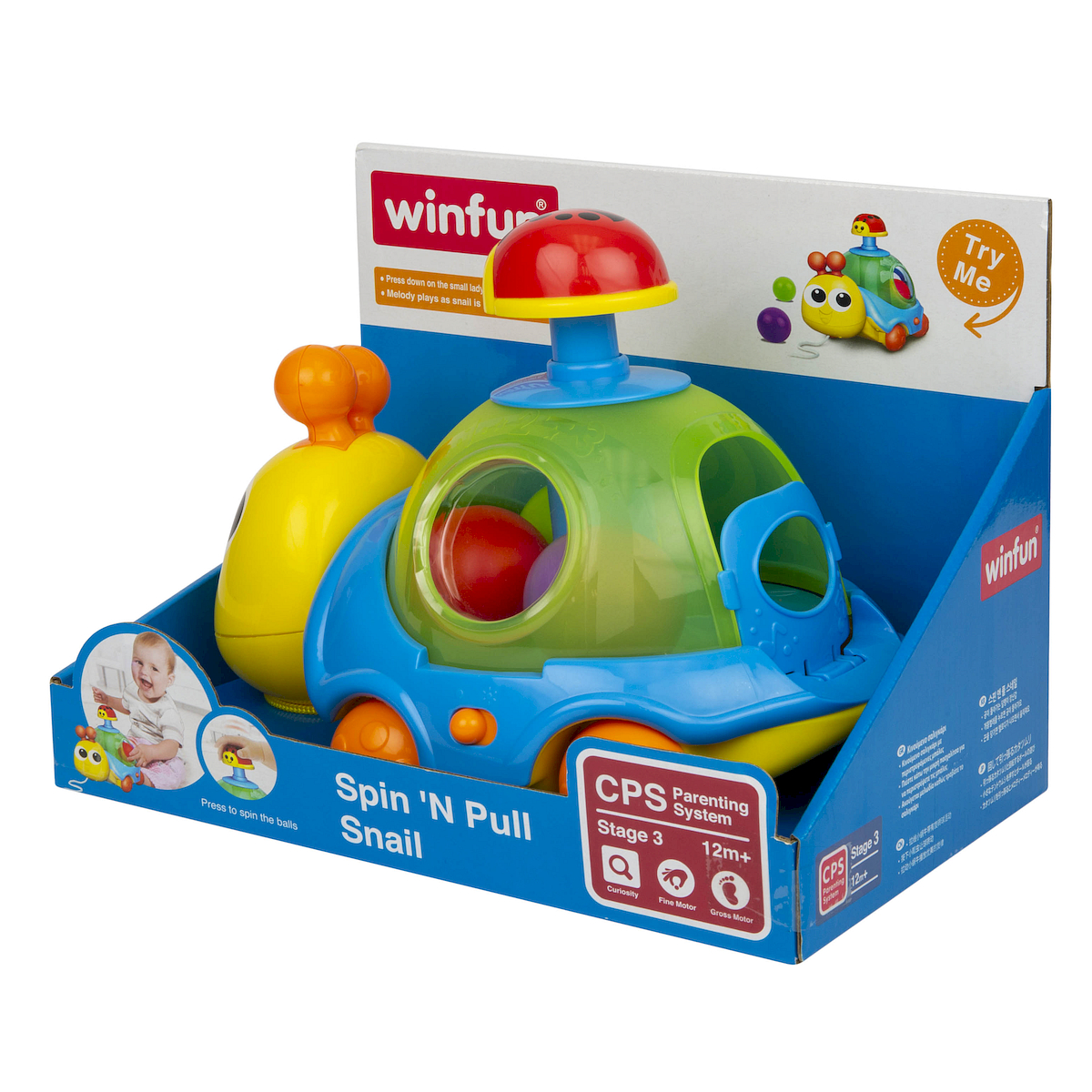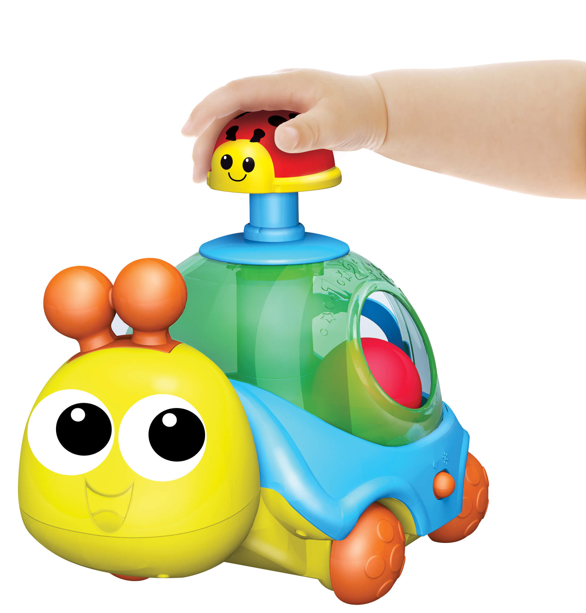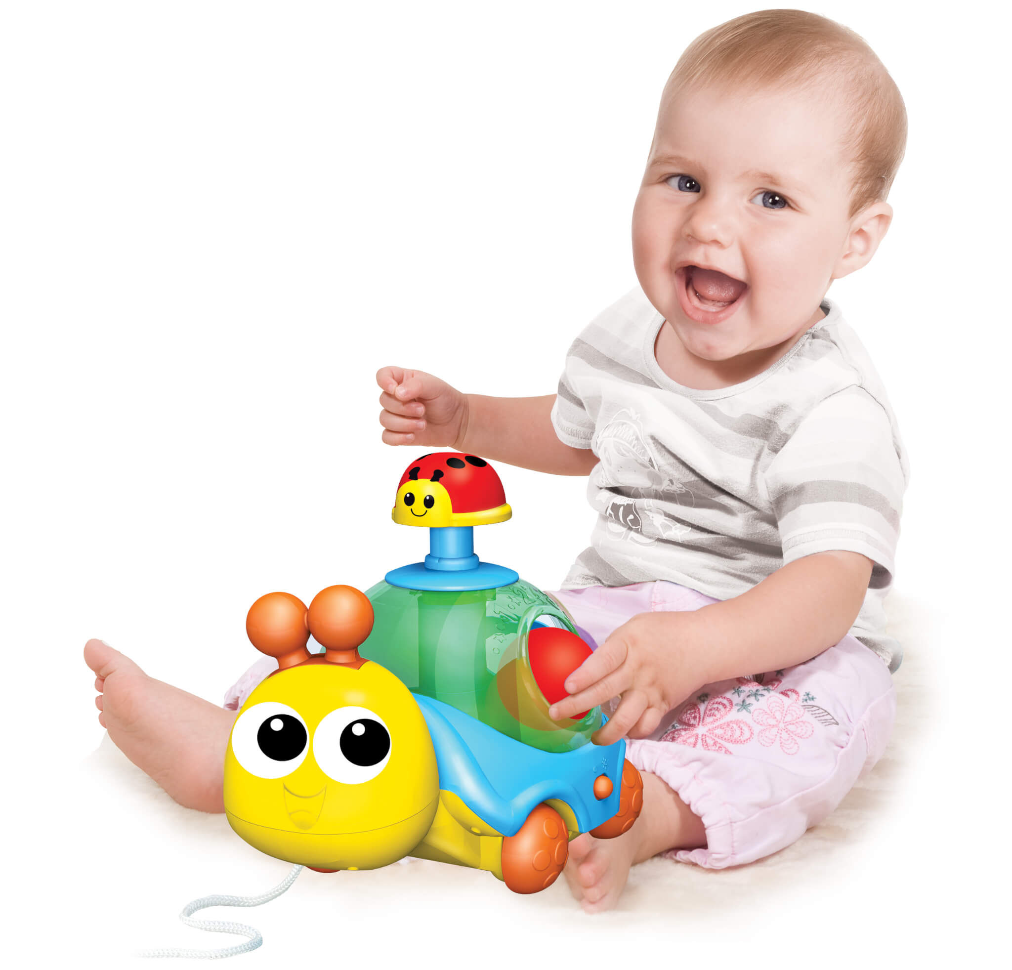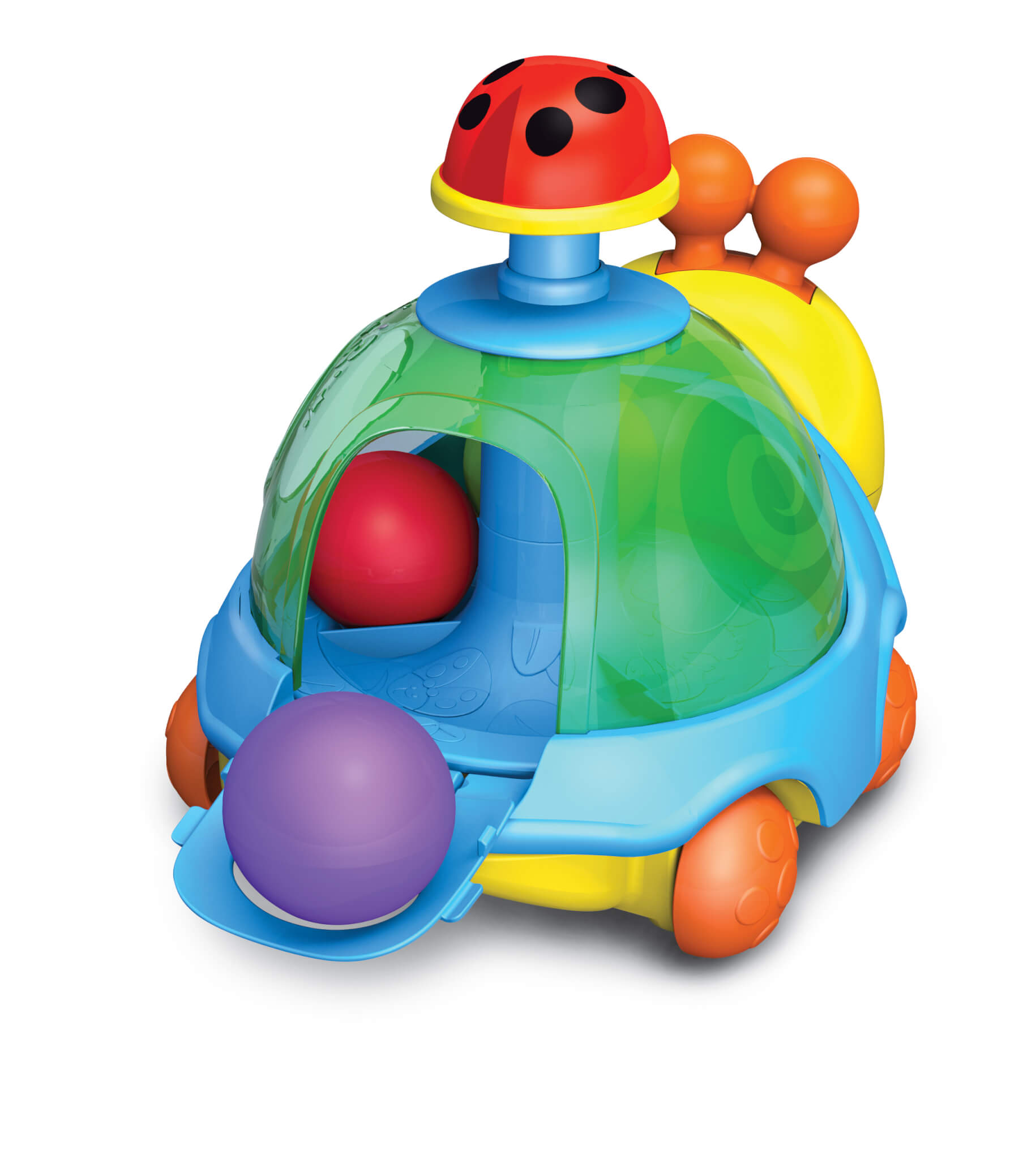 Ślimak Bączek do Ciągnięcia podczas spaceru może gubić piłeczki. Okrągły otwór z boku. Przy użyciu przycisku w kształcie biedronki, piłeczki można wprawić w ruch wewnątrz skorupki. Małe przezroczyste drzwiczki pozwalają dziecku wydobyć piłeczki z wnętrza, wtedy zabawa rozpoczyna się od nowa.