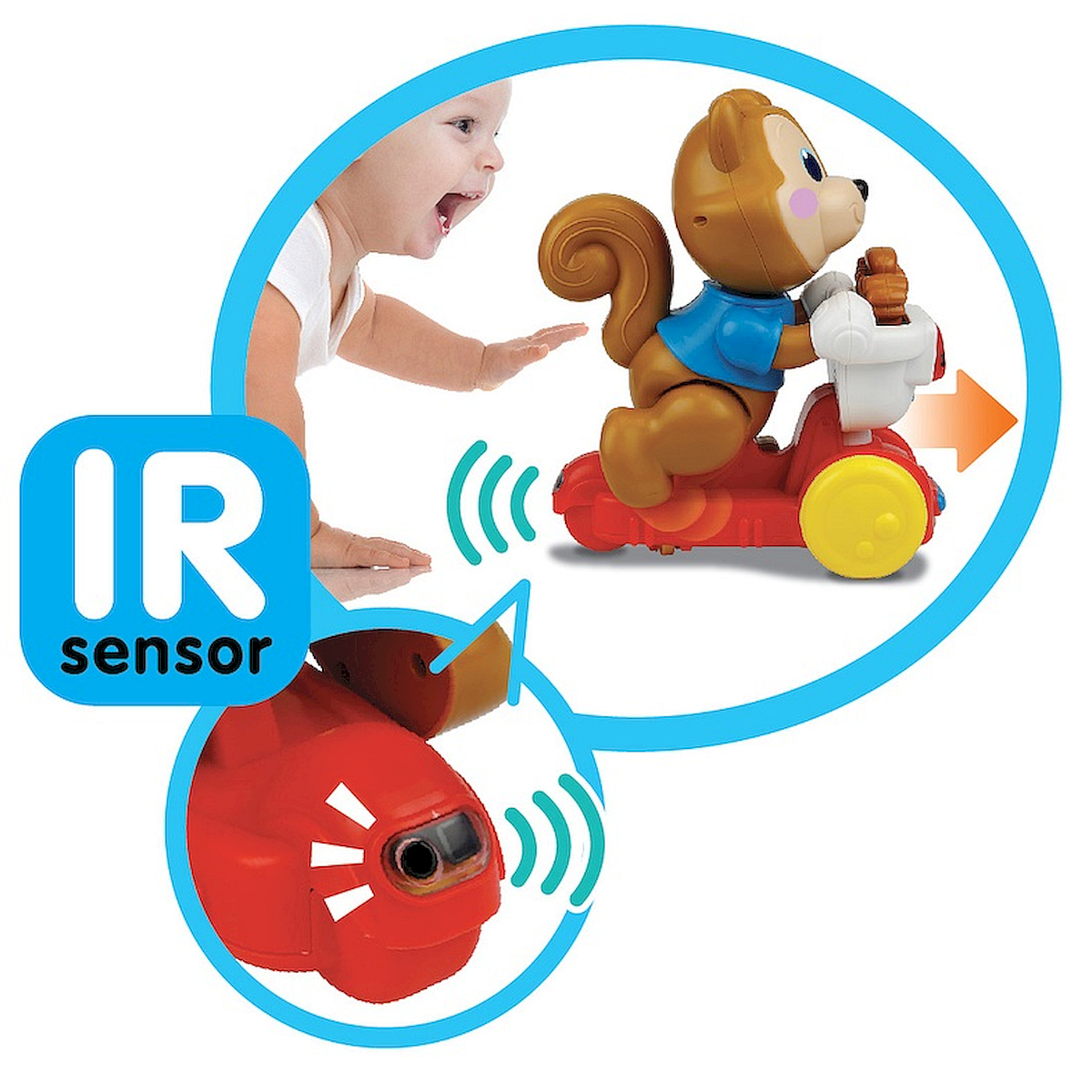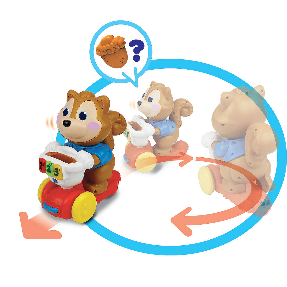 Zwariowana Wiewiórka Złap Mnie mówi po polsku. Słowami zachęca dzieci do zabawy w berka, a także do pogoni za sobą. Skuter na którym jeździ Wiewiórka ma dwa czujniki: z tyłu czujnik ruchu, z przodu odbijacz. Wiewiórka podczas jazdy na skuterze porusza głową i zabawnie „odpycha” się nogą. Kiedy dziecko zabierze jej orzeszka prosi o oddanie go. Kolorowe przyciski 1, 2, 3 uczą podstawowych cyfr, grają melodie i świecą światełkami. Zwariowana Wiewiórka może jechać do przodu, do tyłu i obraca o 360 stopni.