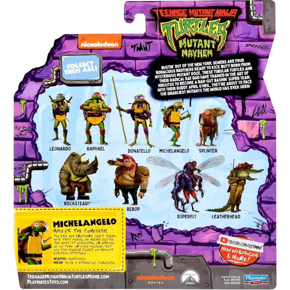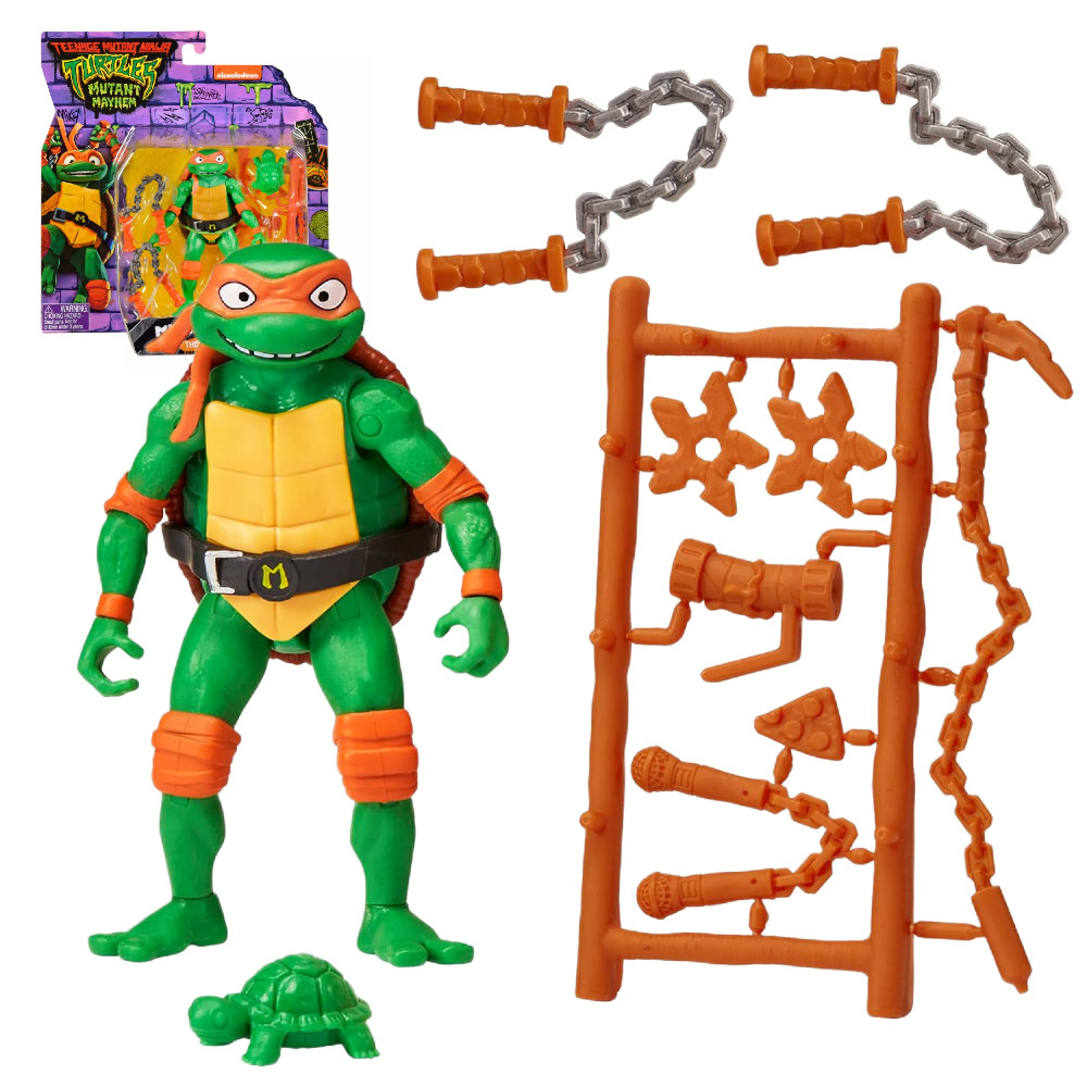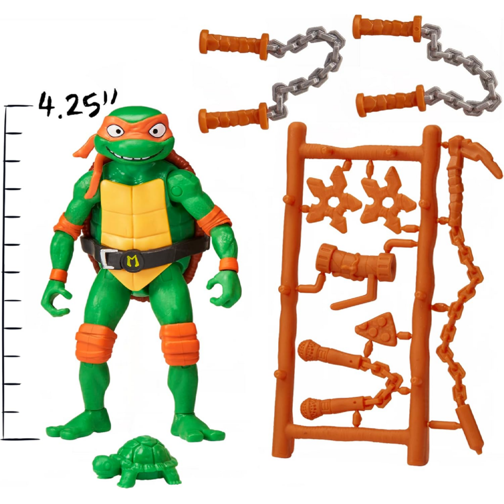 Puk, puk... Czy to działa? Mikey jest najbardziej zabawny z braci, a przynajmniej tak mu się wydaje (chociaż czasami jego bracia to wymagająca widownia). Po treningach z przybranym ojcem, szczurem Splinterem, Michelangelo i jego bracia są wreszcie gotowi na wyprawę do dużego miasta, gdzie Mikey może przetestować swoje żarty. Nic już nie stanie między nim a jego marzeniem, by zostać komikiem, nawet jeśli na razie widownia nie jest zachwycona jego występami... Zupełnie jak z filmu: Figurka Michelangelo ma 11 cm wysokości i została wykonana z dużą dbałością o szczegóły, a dzięki indywidualnym cechom i detalom doskonale pasuje do jego filmowej postaci. Do ustawiania w różnych pozach: Figurka Michelangelo ma 12 ruchomych punktów i doskonale nadaje się do ustawiania w różnych, dynamicznych pozach podczas walki. Akcesoria: Michelangelo jest gotowy do bitwy – ma swoje kultowe nunchaku i stojak na broń z różnymi akcesoriami, a także małego żółwika!
