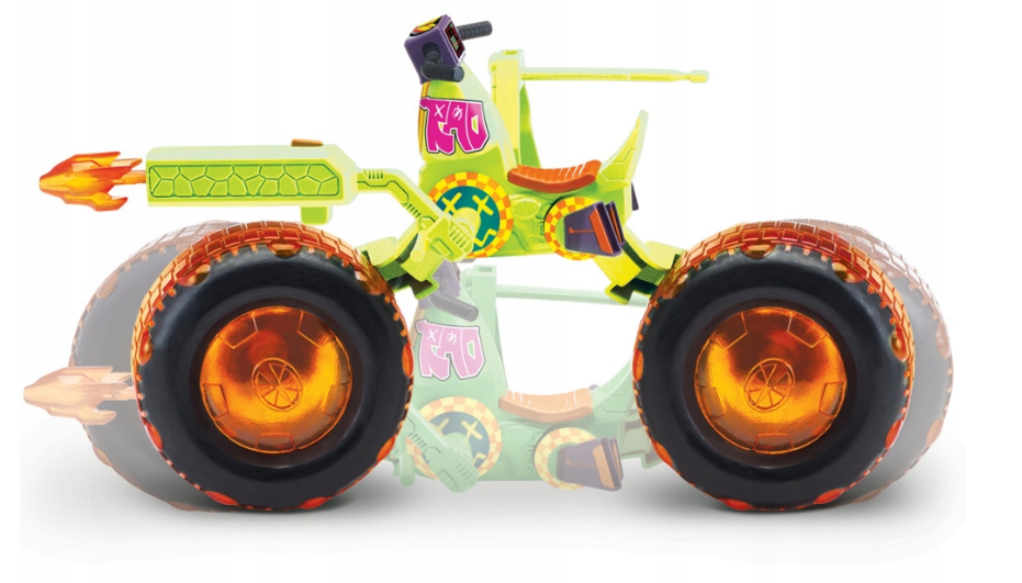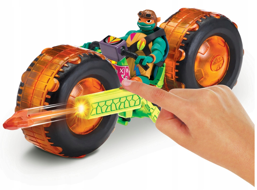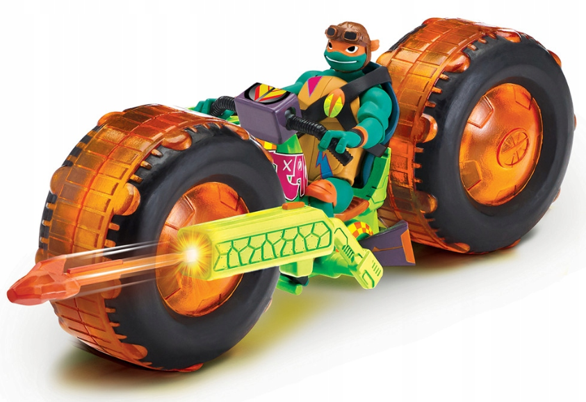 Znany z ekranu motocykl Shell Hog wyposażony został w wyrzutnię pocisków, dzięki której możesz miotać rakiety w mutantów. Motocykl pozwala Wojowniczym Żółwiom Ninja jeszcze skuteczniej walczyć ze złem w Nowym Jorku i w krainach ukrytych pod ziemią! Pojazd wyposażono w specjalną ramę, która pozwoli na połączenie z drugim motocyklem, tworząc w ten sposób unikalną maszynę, której mogą dosiadać aż dwa żółwie!