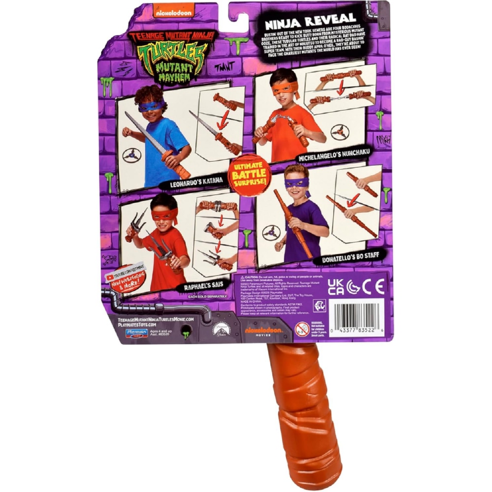 Zmień się w zabawnego Michelangelo z przebojowego filmu "Wojownicze Żółwie Ninja: zmutowany chaos" dzięki zestawowi z nunchaku Michelangelo! Zawiąż na głowie pomarańczową bandanę, chwyć nunchaku i weź gwiazdkę do rzucania, a w jednej chwili zmienisz się w Michelangelo! Gdy złoczyńcy zaatakują, uwolnij moc potężnej broni Mikey'ego, naciskając przycisk nunchaku i obracając nadgarstek, a następnie rozsuń uchwyty - teraz jesteś gotowy do walki! A po wygranej bitwie po prostu wsuń łańcuch z powrotem do rękojeści, aby przygotować się do następnej walki!