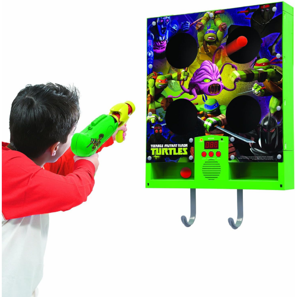 Na planszy znajduje się elektroniczny moduł punktacji z efektami świetlnymi i dźwiękowymi, który aktywuje się przy każdym celny strzale. Tarcza może być zawieszona na drzwiach lub ścianie, co pozwala łatwo dopasować miejsce zabawy w domu. Wyrzutnia T-blaster wyposażona w mechanizm sprężynowy umożliwia szybkie i dynamiczne strzelanie, a specjalne uchwyty pozwalają na wygodne przechowywanie wszystkich elementów.