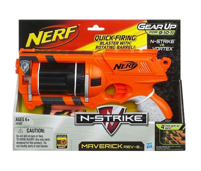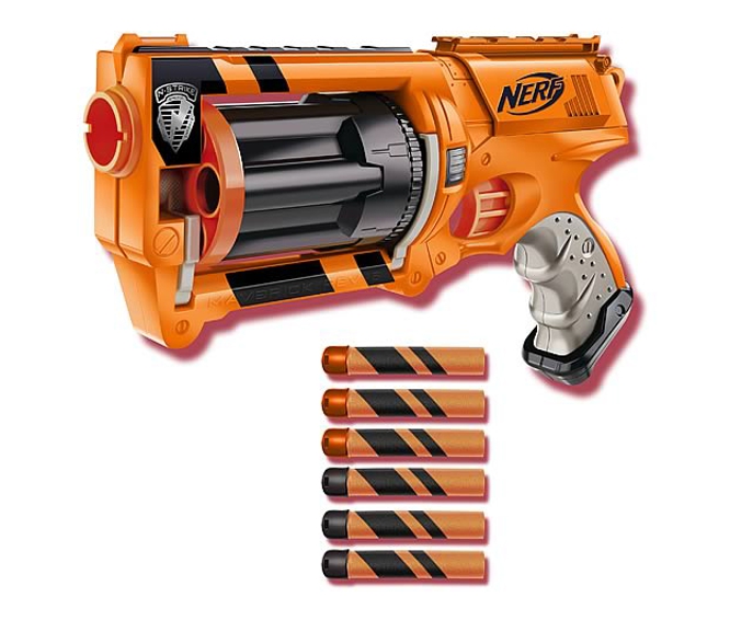 Nerf Maverick 34380 to szczciostrzałkowa wyrzutnia, dzięki której przeniesiesz swoją rozgrywkę Nerf na kolejny poziom! Wyrzutnia N-Strike Maverick REV-6 posiada między innymi szybko strzelający obrotowy magazynek oraz szynę taktyczną, do której można doczepiać osłony i celowniki z innych wyrzutni Nerfa.