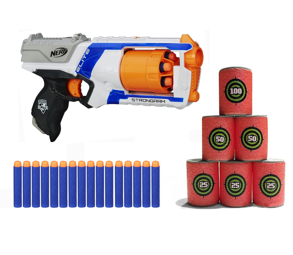 Wyrzutnia Nerf N-Strike Elite Strongarm XD 36033 + strzałki + cele to następca klasycznego i bardzo popularnego blastera Maverick Rav-6. Strongarm należy do nowej linii N-strike Elite XD, która charakteryzuje się bardzo dalekim zasięgiem strzałek do 27 metrów. Elite Strongarm posiada sześciostrzałowy bębenkowy magazynek, szynę taktyczną nad lufą oraz dwa uchwyty na pasek lub smycz.