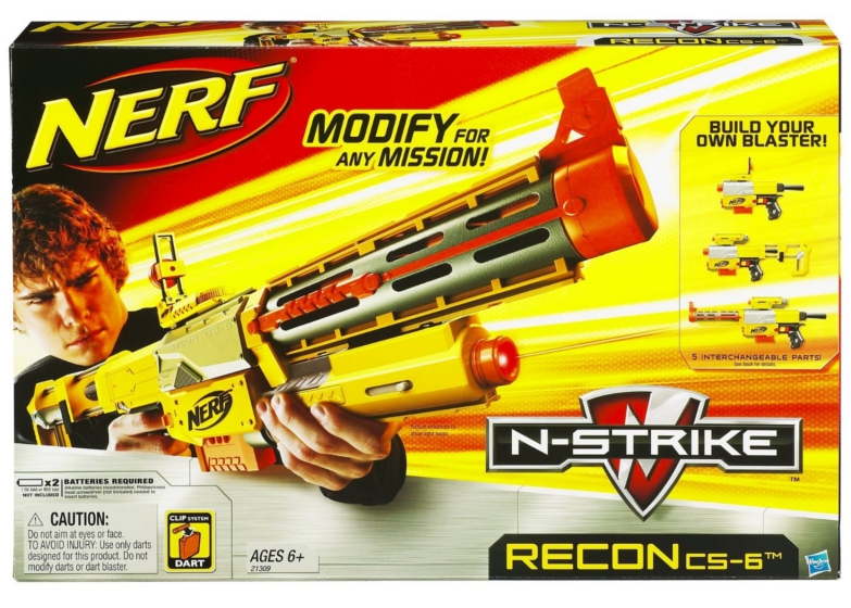 Nerf Recon CS-6 21309 to wyrzutnia na strzałki N-Strike, wyjątkowa ze względu na swoje możliwości dopasowania do potrzeb sytuacji. Może działać zarówno jako mała i poręczna wyrzutnia, a po doczepieniu kolby, celownika laserowego i tłumika stać się zdecydowanie bardziej precyzyjna. Posiada sześciostrzałowy magazynek typu Clip System, który można bardzo łatwo wymienić i załadować. Dostępna tylko wyrzutnia w kolorze żółtym. Zasięg wyrzutni to ponad 10 metrów. Czas wkroczyć do akcji!