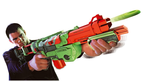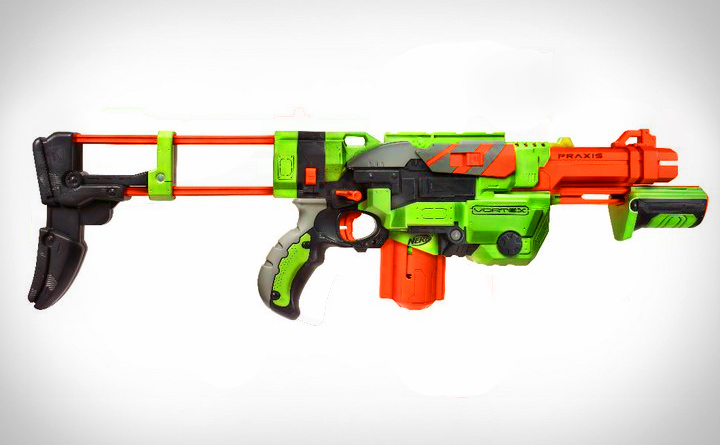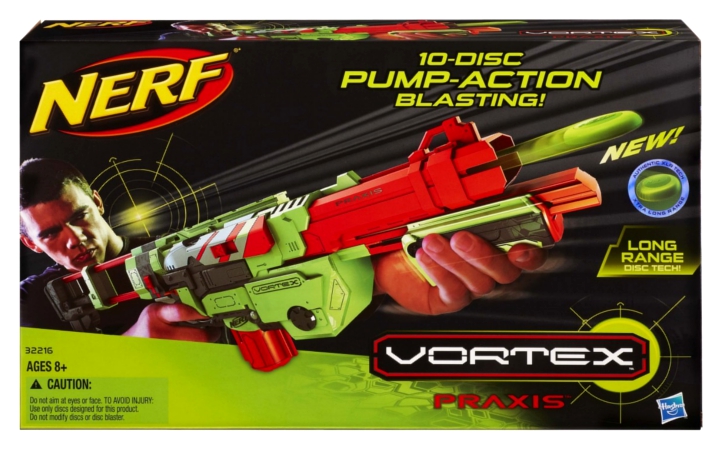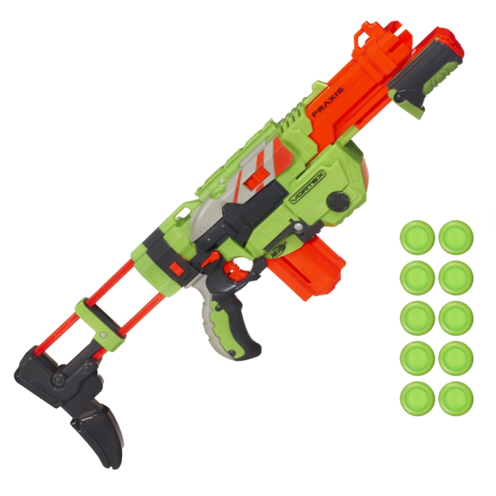 Wyrzutnia Nerf Vortex Praxis to wyrzutnia z dziesięciodyskowym magazynkiem. Załaduj dyski, uzbroj wyrzutnię, wyceluj i ognia! Teraz możesz wystrzelić 10 dysków bez przeładowywania! Wyrzutnia posiada także wyjmowaną przedłużaną kolbę oraz wyjmowany magazynek. Praxis posiada pompkę z przodu dzięki której uzbrajamy wyrzutnię. Seria Vortex charakteryzuje specjalnymi dyskami (plastik otoczony gumą) które zapewniają bardzo daleki zasięg. Zasięg Vortex Praxis to ponad 20 metrów.