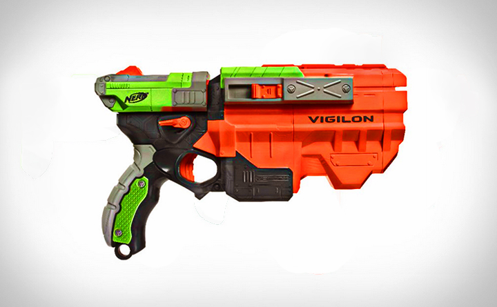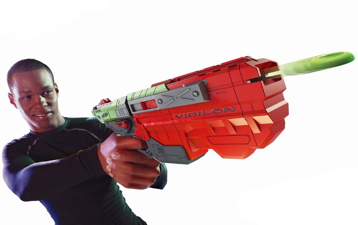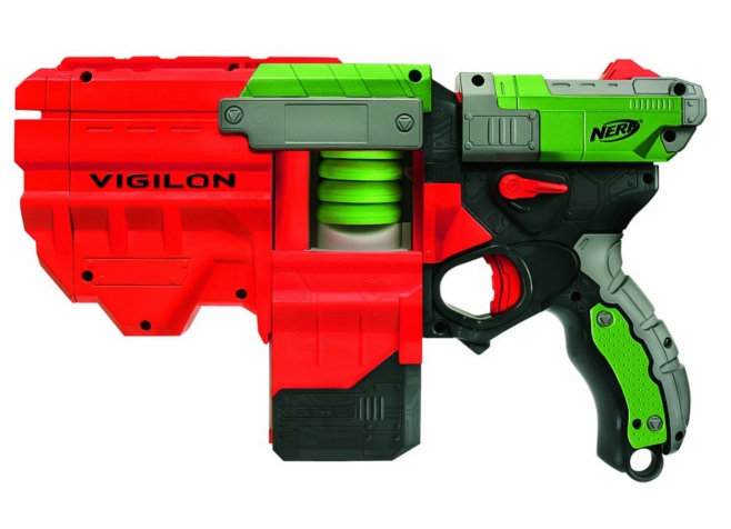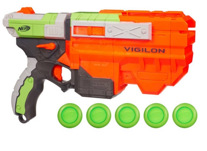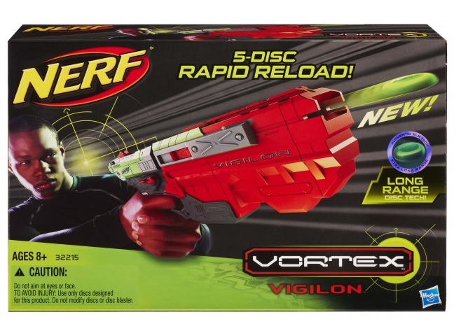 Wyrzutnia Nerf Vortex Vigilon to wyrzutnia dysków z magazynkiem, który umożliwia strzelanie bez przeładowywania. W magazynku zmieści się pięć dysków. Vortex Vigilon umożliwia błyskawiczne ładowanie i strzelanie. Załaduj dyski, uzbroj wyrzutnię, wyceluj i ognia! Teraz możesz wystrzelić 5 dysków bez przeładowywania! Seria Vortex charakteryzuje specjalnymi dyskami (plastik otoczony gumą) które zapewniają bardzo daleki zasięg - ponad 30 metrów!