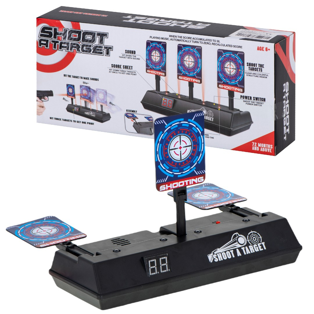 Teraz w zestawie z wyrzutnią otrzymasz Elektroniczną tarczę zliczającą punkty. Tarcza składa się z podstawki i trzech ruchomych celów. Każdy cel, po trafieniu, kładzie się do tyłu. Po zestrzeleniu trzech celi uzyskujemy jeden punkt i wszystkie cele automatycznie podnoszą się do góry. Tarcza posiada efekty świetlne i dźwiękowe. Zbierz przyjaciół, załadujcie wyrzutnie i sprawdźcie swoją celność!Wymagane baterie tarcza: 3 x 1,5V AA LR6 (brak w zestawie)