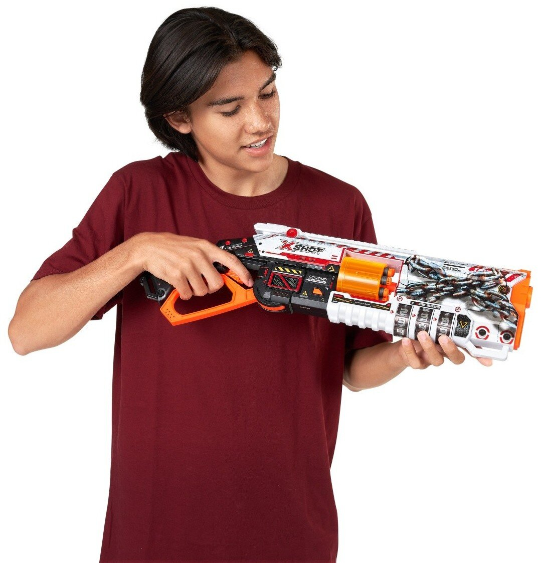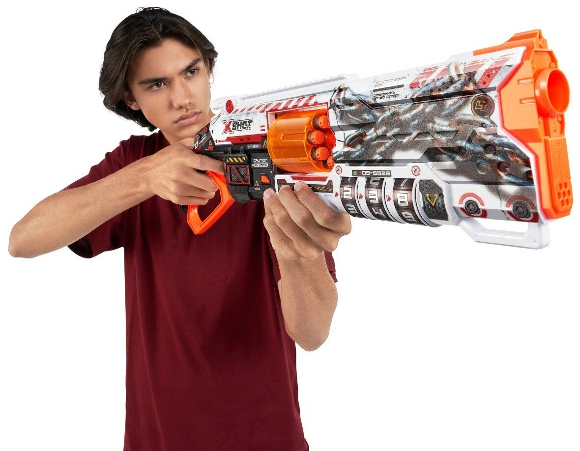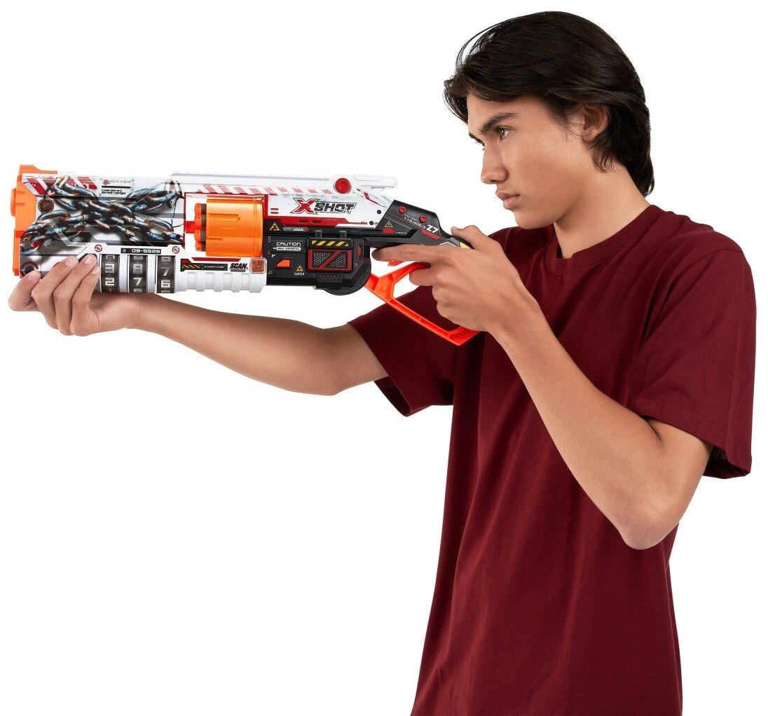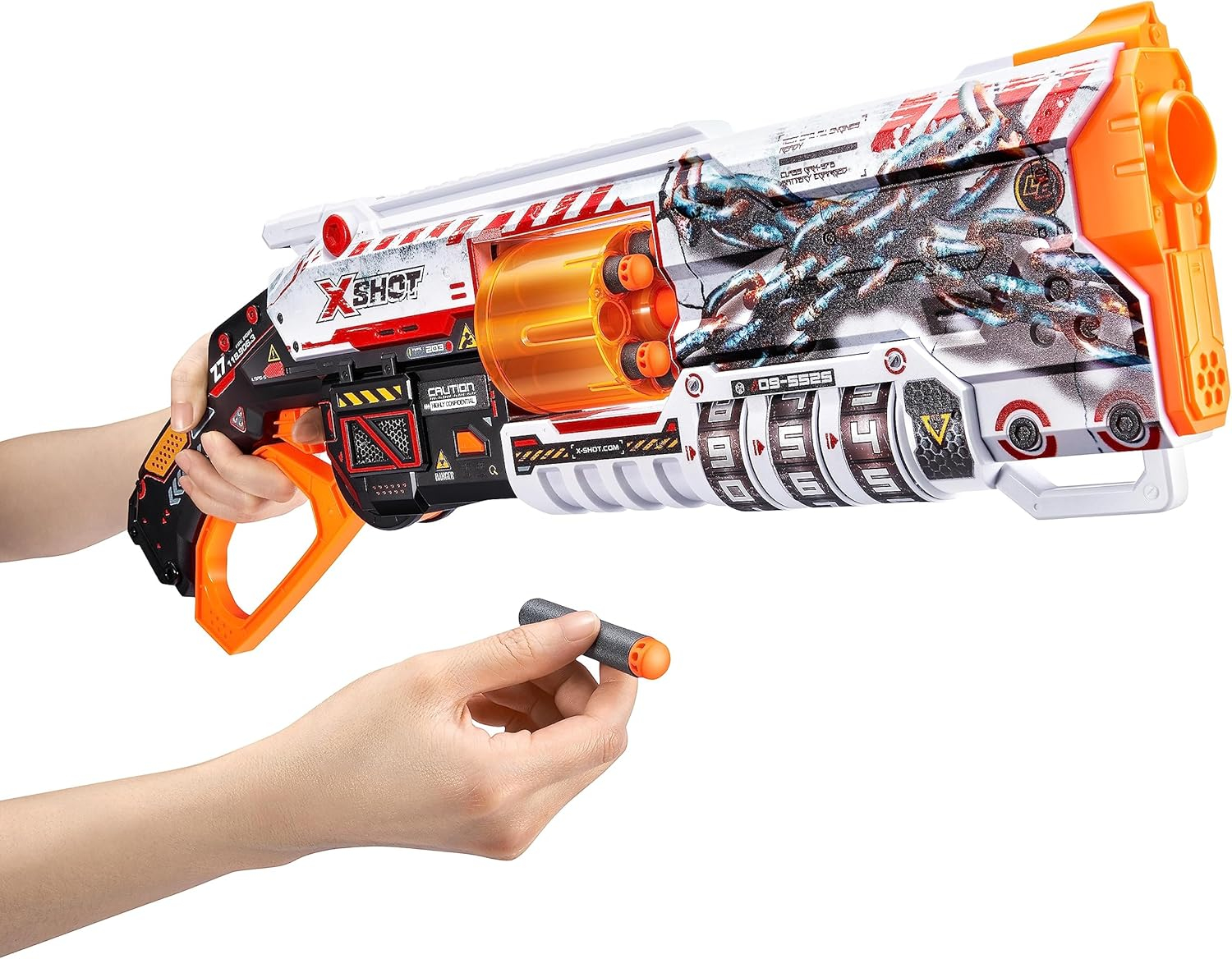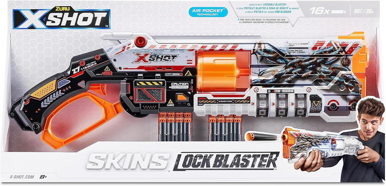 Wyrzutnia X-Shot Skins Lock Blaster daje Ci moc w Twoich rękach! Każdy pistolet ma kod QR, który pozwala odkryć unikalną kombinację zamka. Odblokuj swoją wyrzutnię, żeby zacząć zabawę! Lock Blaster ma obrotowy magazynek na 8 strzałek i celność nawet do 30 metrów! Po zakończeniu bitwy zablokuj wyrzutnię, a nikt inny nie będzie mógł jej używać!