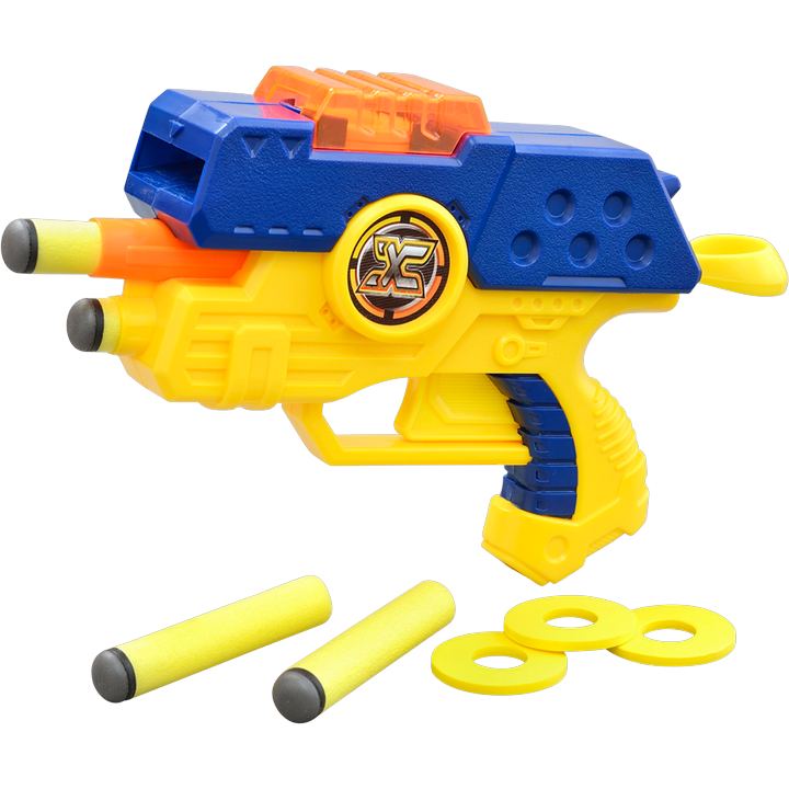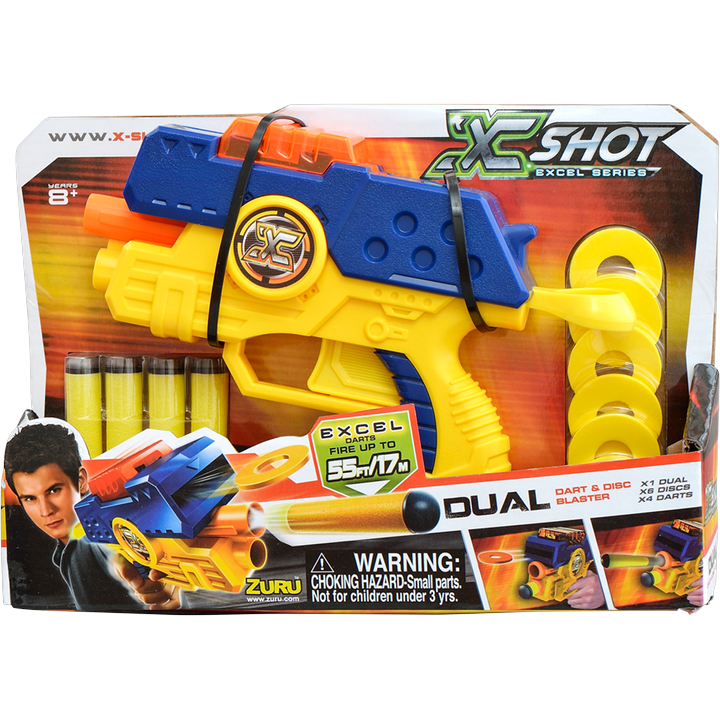XShot Dual Blaster SH3602 to wyrzutnia, która łączy w sobie dwa systemy strzelania. Posiada możliwość strzelania równocześnie strzałkami oraz dyskami. Załaduj wyrzutnię i zaskocz przeciwnika podwójnym strzałem.