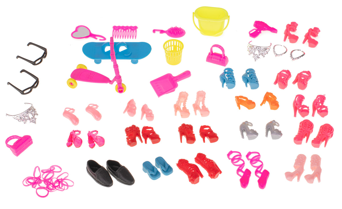 Kolorowe ubranka i akcesoria dopasowane do niemal każdej lalki takiej jak Barbie, Steffi, Fleur i innych lalek o wysokości ok. 30cm. Różnorodność ubranek, dodatków i akcesoriów dla lalek zapewni zabawę na wiele godzin. Możesz wcielić się w rolę stylisty, czy projektanta mody, ale również zestaw będzie stanowić wspaniałe uzupełnienie twojej kolekcji lalek. W zestawie znajdują się sukienki, buty, wieszaki na ubrania, a także przedmioty codziennego użytku takie jak zestaw przyborów kuchennych, miotła z szufelką, ale również deskorolka czy też hulajnoga.