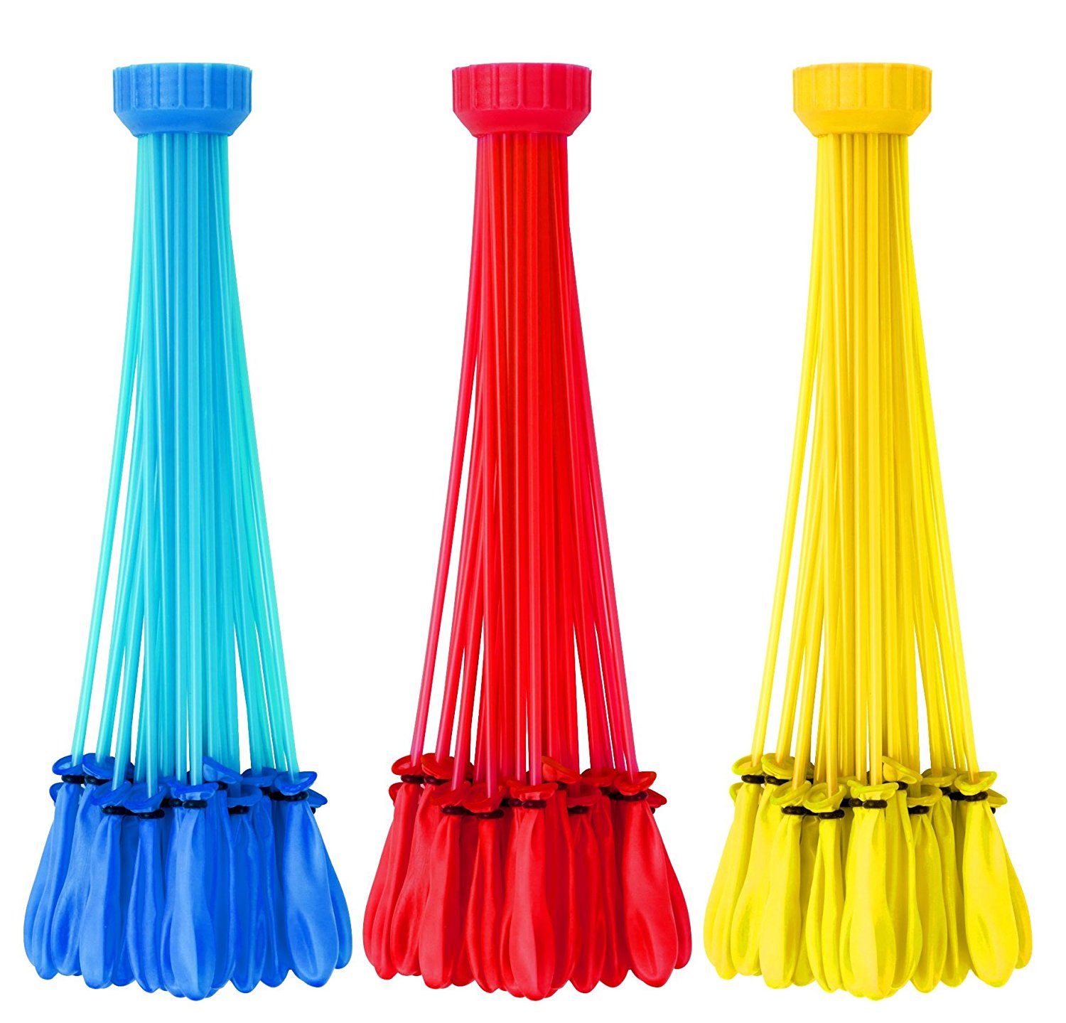 Buncho Balloons od Zuru to 3 zestawy balonów z nasadką na kran, w 3 kolorach (łącznie 100 szt). Każdy przymocowany jest do słomki za pomocą gumki, która po napełnieniu wodą zaciska się automatycznie na balonie. Dzięki systemowi szybkiego napełniania 100 balonów można napełnić tylko w 60 sekund.